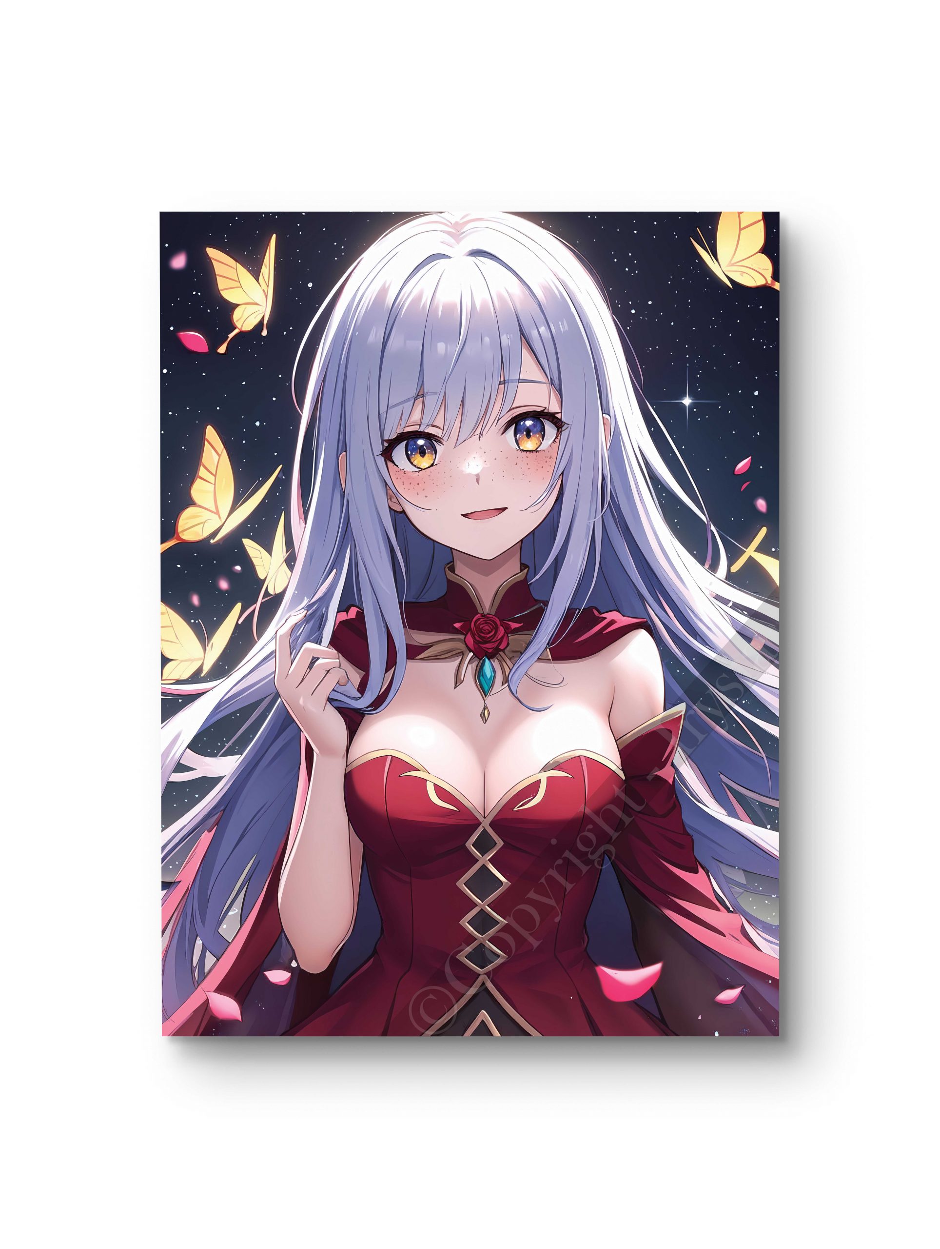Baignée dans la lumière argentée de la nuit, cette femme en robe rouge respire la grâce et la noblesse. Ses cheveux argentés flottent sous la douce brise nocturne, créant une atmosphère apaisante et romantique. Une pièce parfaite pour une décoration chic et harmonieuse. Disponible en plusieurs tailles et supports (toile, châssis entoilé, verre, verre acrylique, aluminium).