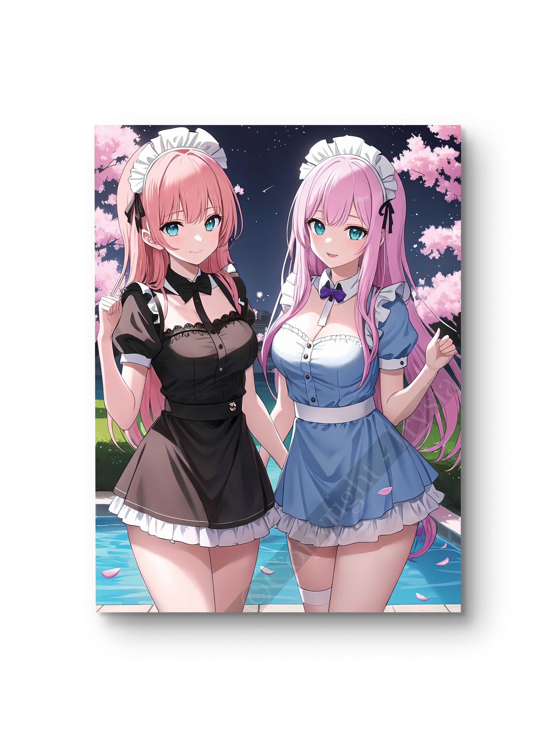 Ce tableau en style anime représente deux jeunes femmes habillées en maids, posant avec élégance près d’un plan d’eau entouré de cerisiers. L’harmonie des couleurs et le raffinement des tenues ajoutent une touche d’élégance et de romantisme à cette œuvre, idéale pour une décoration immersive et raffinée. Disponible en plusieurs tailles et supports (toile, châssis entoilé, verre, verre acrylique, aluminium).
