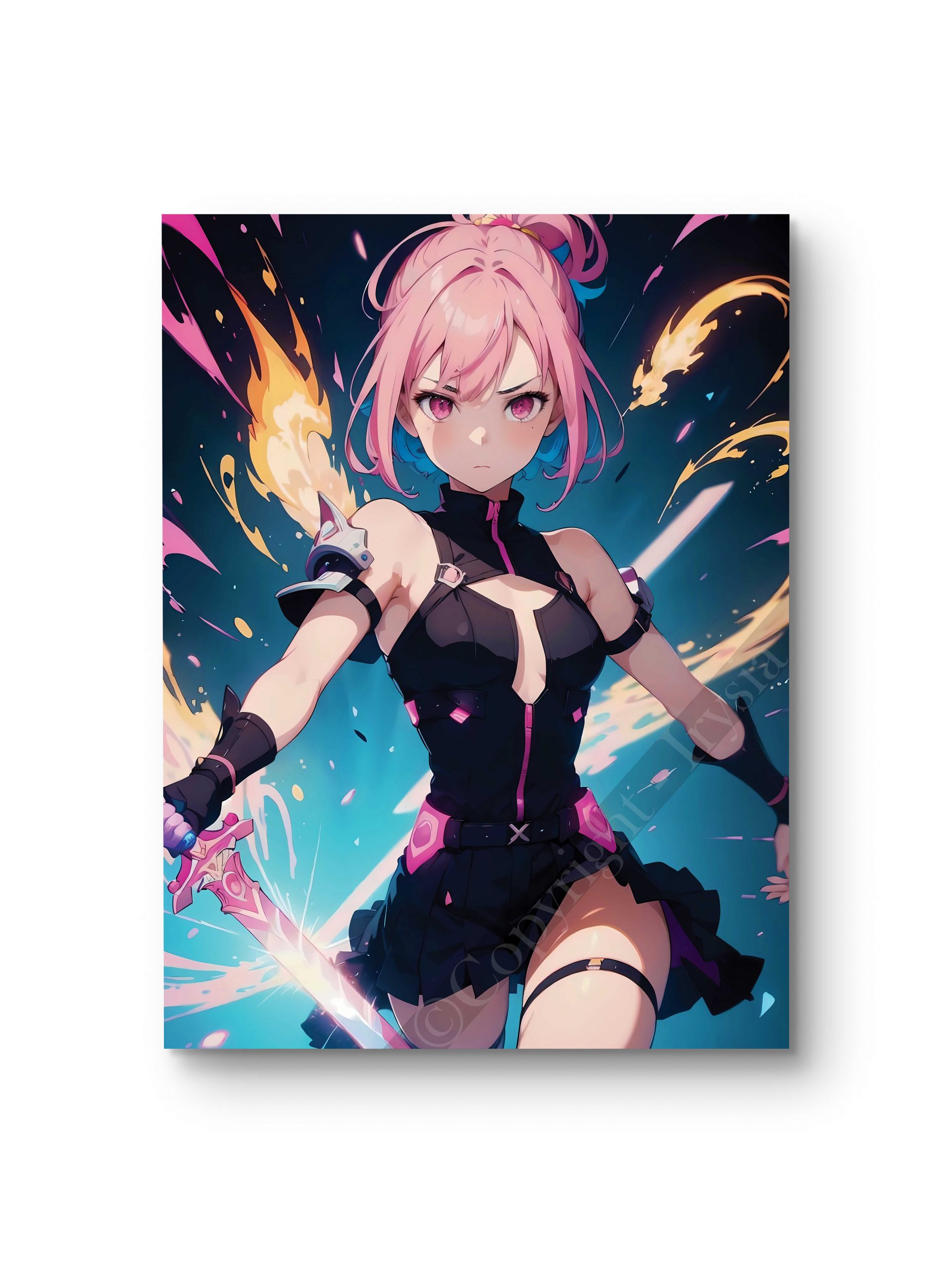 Plongez dans une bataille ardente avec ce tableau en style anime représentant une guerrière entourée de flammes. Son regard déterminé et sa pose imposante traduisent une force inébranlable. Les contrastes vibrants de couleurs ajoutent une intensité dramatique à l’œuvre. Parfait pour une décoration énergique et audacieuse. Disponible en plusieurs tailles et supports (toile, châssis entoilé, verre, verre acrylique, aluminium).