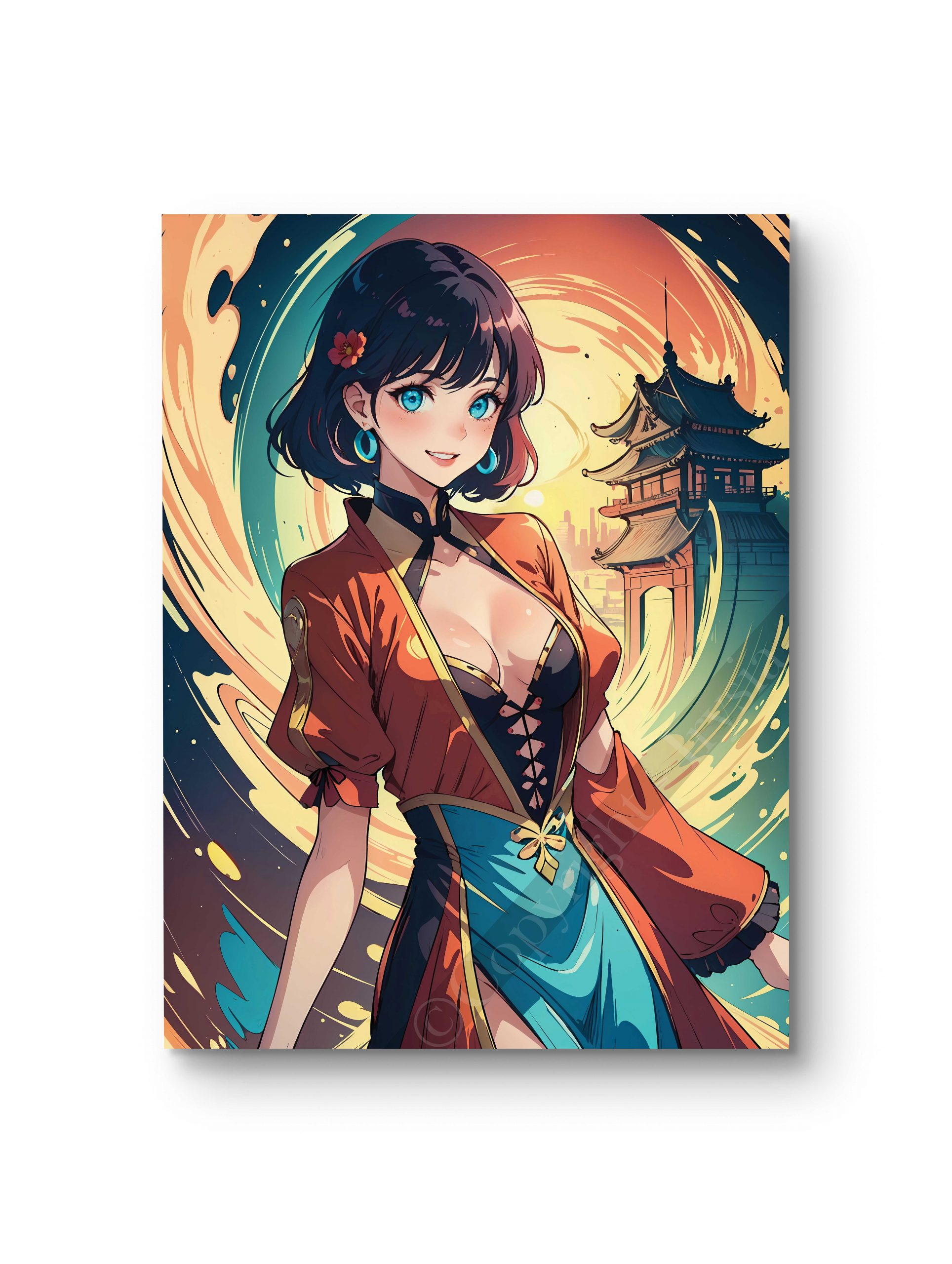 Inspiré des légendes du phoenix, ce tableau en style anime met en scène une danseuse élégante évoluant au milieu d’un tourbillon de flammes dorées. Sa tenue raffinée et son regard captivant en font une œuvre idéale pour une décoration sophistiquée et envoûtante. Disponible en plusieurs tailles et supports (toile, châssis entoilé, verre, verre acrylique, aluminium).