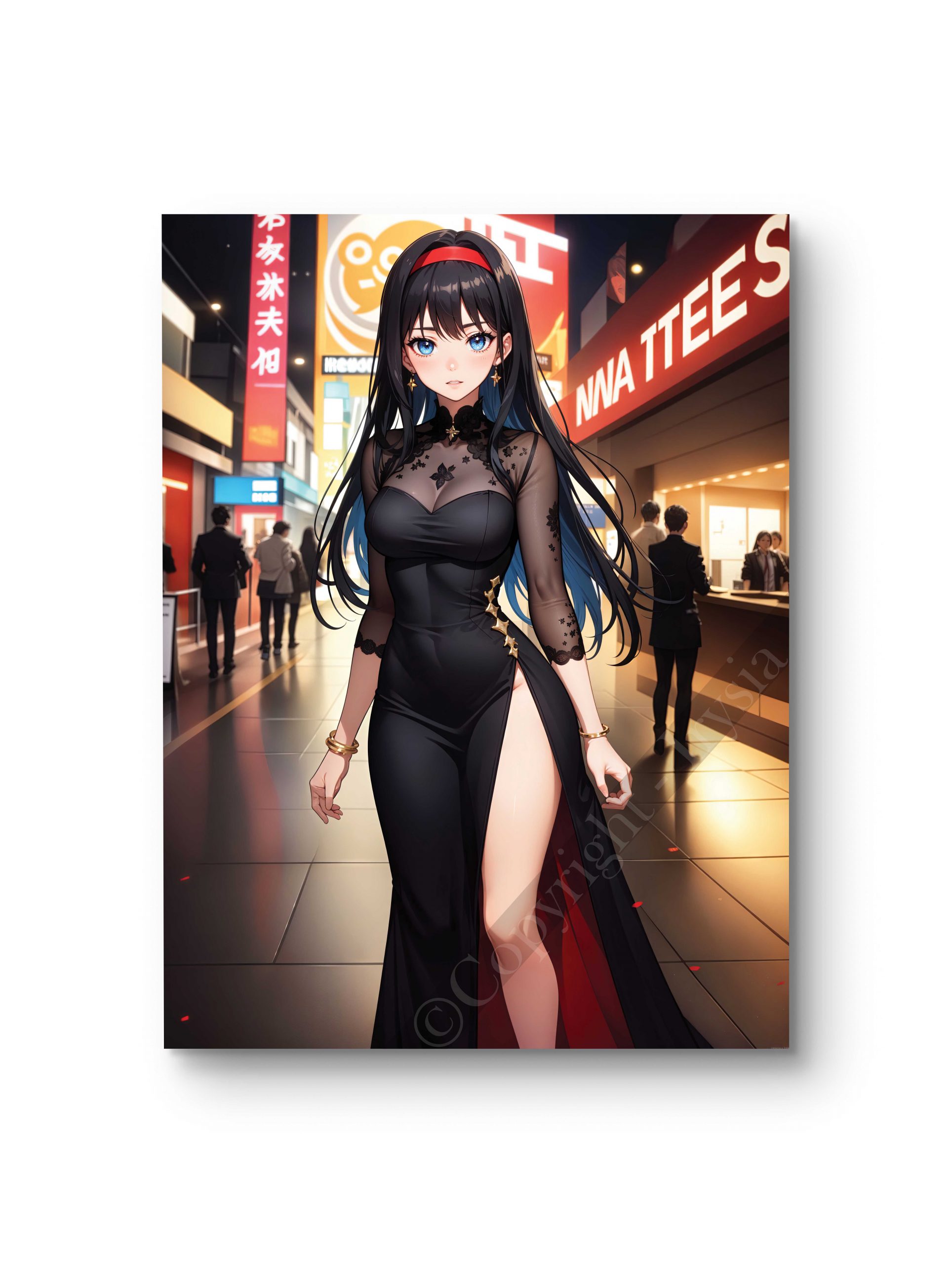 Plongez dans l’atmosphère glamour d’une ville illuminée avec ce tableau en style anime représentant une femme en robe noire raffinée. Son regard hypnotisant et son allure distinguée en font une œuvre idéale pour apporter une touche d’élégance et de modernité à votre intérieur. Disponible en plusieurs tailles et supports (toile, châssis entoilé, verre, verre acrylique, aluminium).
