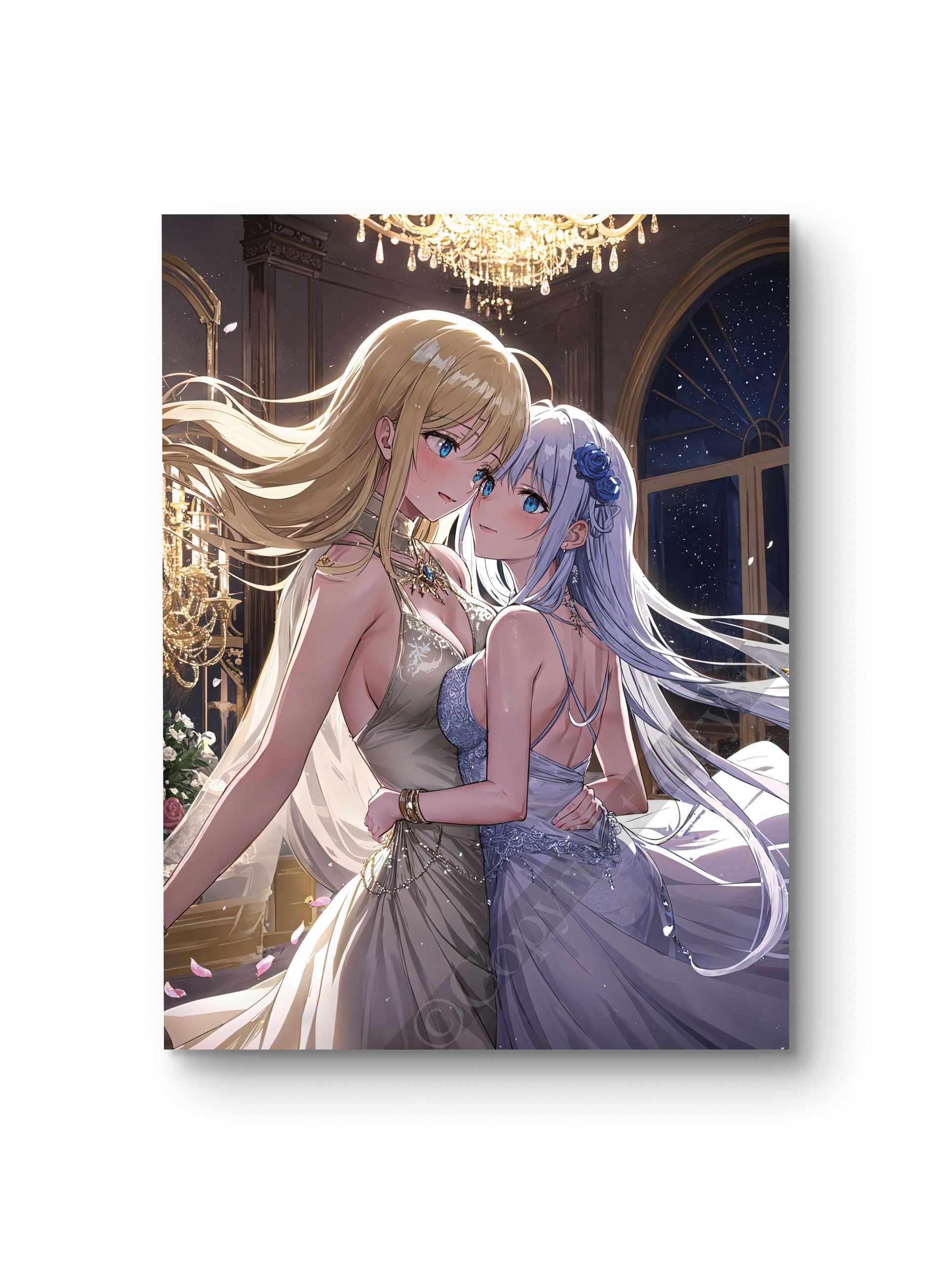 Sous un lustre éclatant, deux jeunes femmes dansent avec grâce et élégance, capturant l’intimité d’un moment suspendu. Leur regard complice et l’atmosphère lumineuse du décor apportent une touche de romantisme et de raffinement, parfait pour une décoration élégante et moderne. Disponible en plusieurs tailles et supports (toile, châssis entoilé, verre, verre acrylique, aluminium).