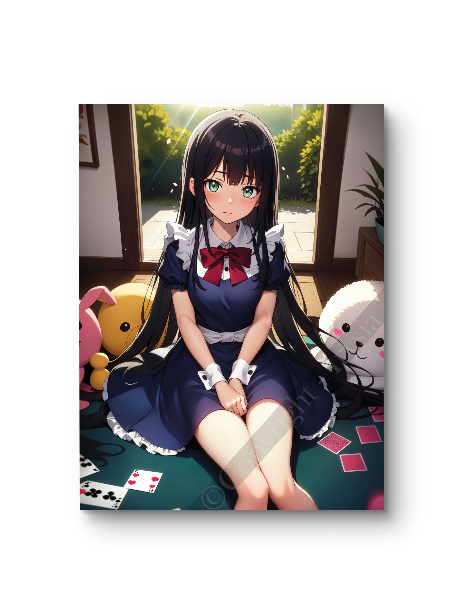 Dans une ambiance chaleureuse et réconfortante, cette jeune femme en tenue de maid est assise sur un tatami entourée de peluches et de jeux de cartes. Son sourire discret et la lumière douce qui baigne la scène confèrent à cette œuvre une sensation de nostalgie et de douceur, idéale pour une décoration cosy et immersive. Disponible en plusieurs tailles et supports (toile, châssis entoilé, verre, verre acrylique, aluminium).