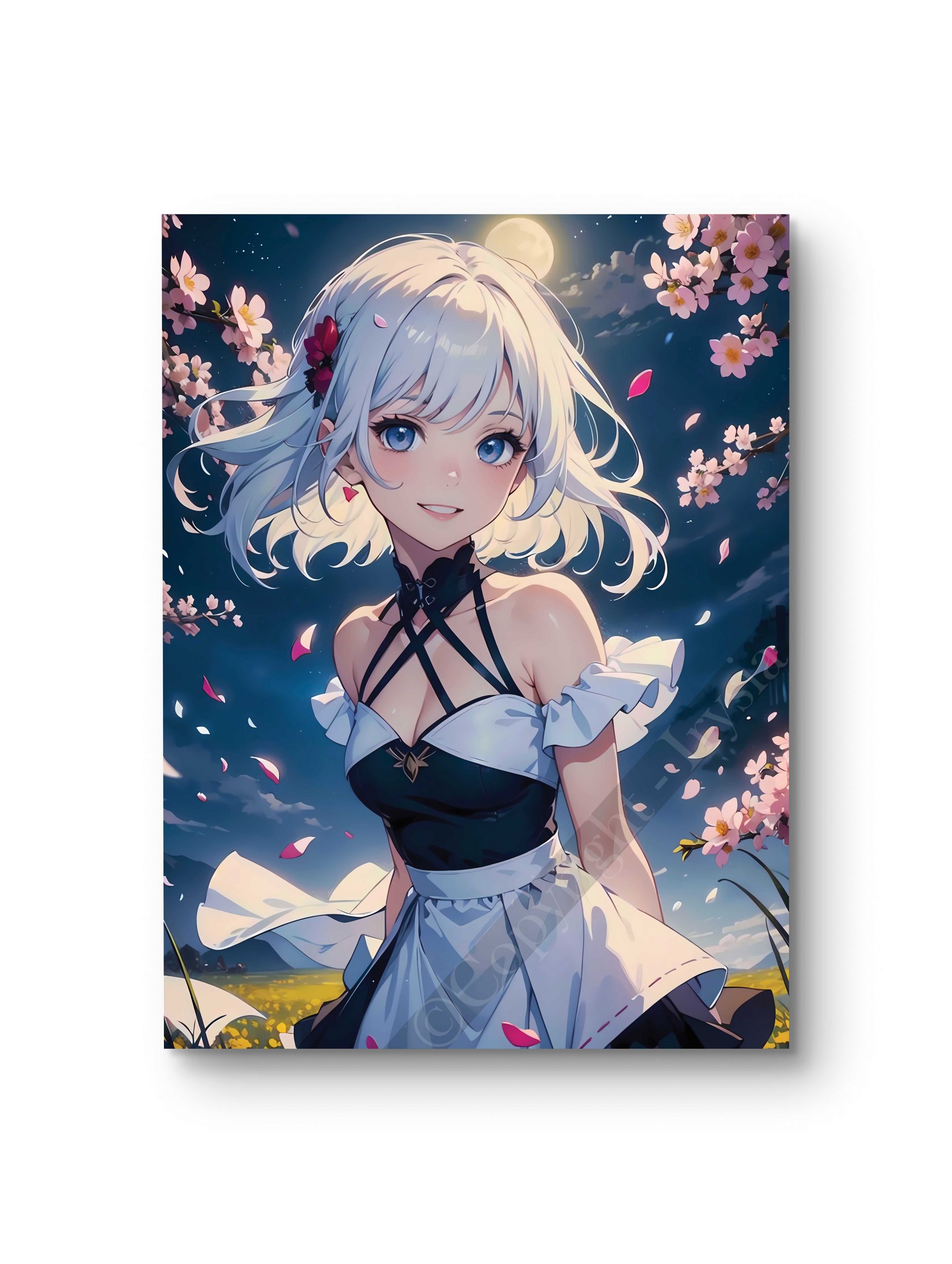 Ce tableau anime met en scène une jeune femme sous un cerisier en fleurs, sa tenue légère ondulant dans la brise du printemps. Son regard pétillant et la douce lumière environnante créent une atmosphère lumineuse et joyeuse, idéale pour une décoration raffinée et pleine de vie. Disponible en plusieurs tailles et supports (toile, châssis entoilé, verre, verre acrylique, aluminium).
