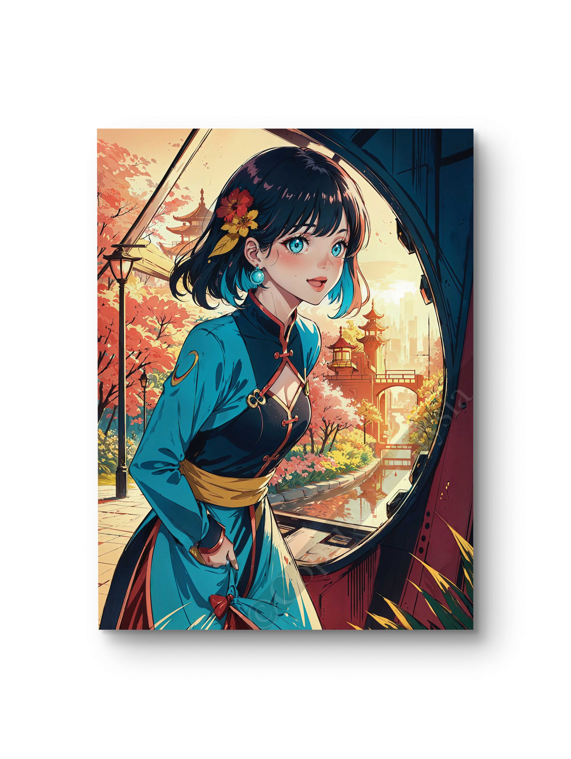 Ce tableau en style anime illustre une femme vêtue d’une robe traditionnelle, se promenant sous un ciel automnal aux teintes chatoyantes. Son regard serein et l’atmosphère apaisante du décor en font une pièce parfaite pour une décoration chaleureuse et raffinée. Disponible en plusieurs tailles et supports (toile, châssis entoilé, verre, verre acrylique, aluminium).