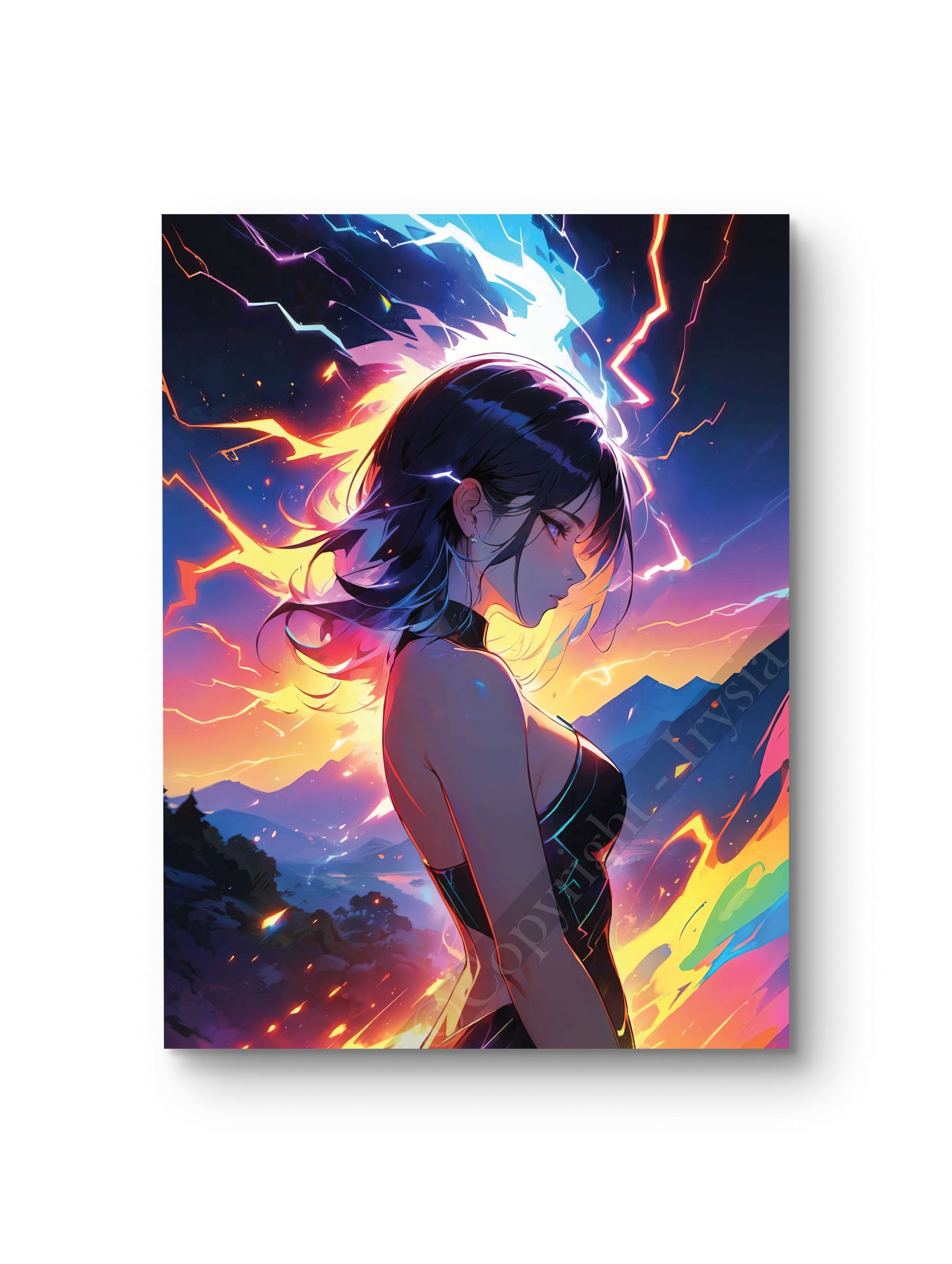 Un tableau spectaculaire illustrant une femme dans un décor enflammé, entourée de lumières électriques et intenses. L’énergie de cette œuvre lui confère une présence puissante et inspirante. Parfait pour ajouter une touche de force et de passion à votre intérieur. Disponible en plusieurs tailles et supports : toile, châssis entoilé, verre, verre acrylique et aluminium.