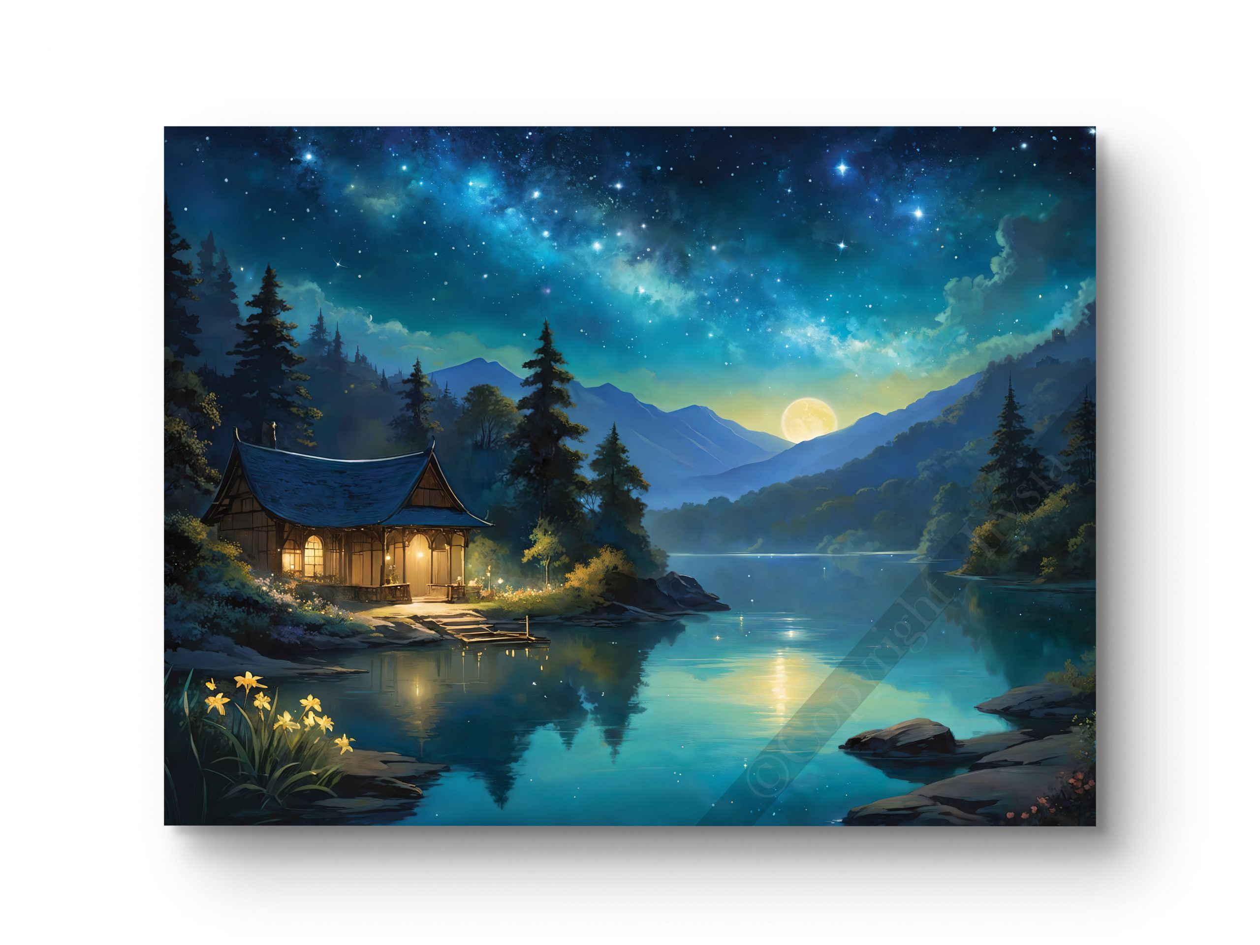Ce tableau captivant représente une cabane illuminée au bord d’un lac sous un ciel étoilé. L’éclairage chaleureux contraste harmonieusement avec les tons profonds du bleu nuit, offrant une ambiance réconfortante et immersive. Idéal pour une décoration cocooning et élégante, ce tableau est disponible sur toile, châssis entoilé, verre, verre acrylique et aluminium. Grâce à une impression haute définition, il offre un rendu éclatant et une durabilité incomparable, apportant une touche de calme et de mystère à votre intérieur.