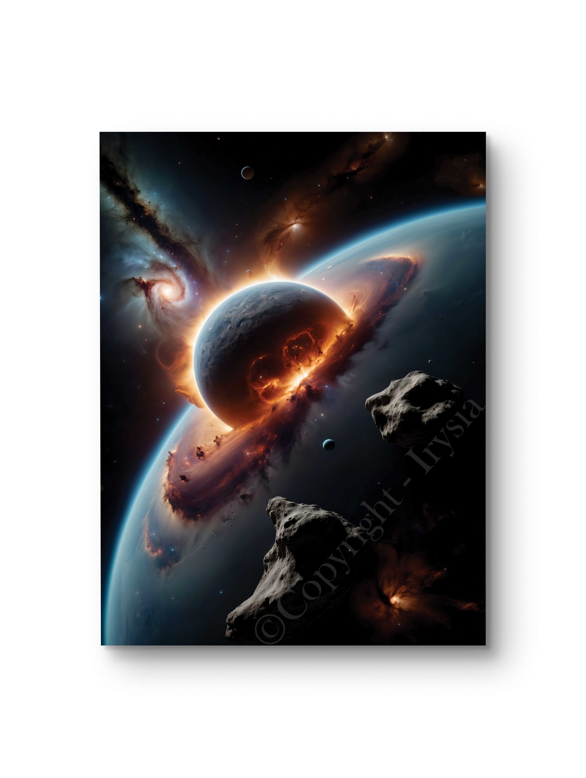 Plongez dans les profondeurs du cosmos avec ce tableau captivant illustrant une collision planétaire spectaculaire. Des fragments de roche dérivent dans l’espace, tandis qu’une planète en flammes se disloque sous la force d’une explosion titanesque. L’intensité des couleurs et le souci du détail donnent une impression de mouvement et de grandeur infinie. Cette scène cosmique illustre la puissance de l’univers et son évolution perpétuelle. Idéal pour une décoration inspirée de la science-fiction et de l’astronomie, ce tableau est disponible en impression haute définition sur toile, châssis entoilé, verre, verre acrylique et aluminium.