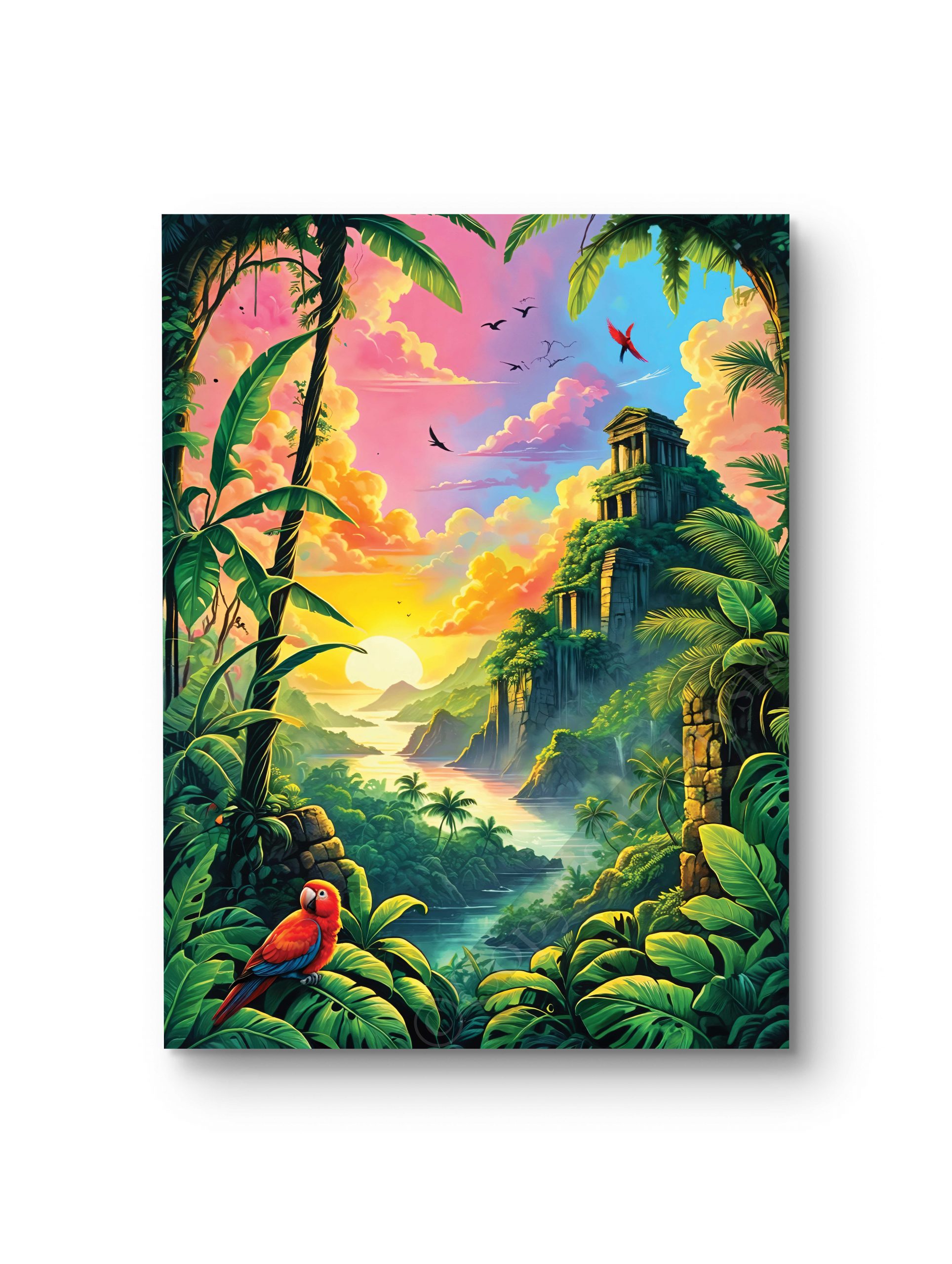 Ce tableau enchanteur capture un paysage tropical où les montagnes se fondent dans une atmosphère colorée et lumineuse. L’ajout de perroquets et d’une flore dense donne une dimension vivante et authentique à cette scène. Idéal pour une décoration qui invite au voyage et à la détente, ce tableau est disponible en plusieurs supports : toile, châssis entoilé, verre, verre acrylique et aluminium, garantissant une qualité d’impression exceptionnelle et durable.