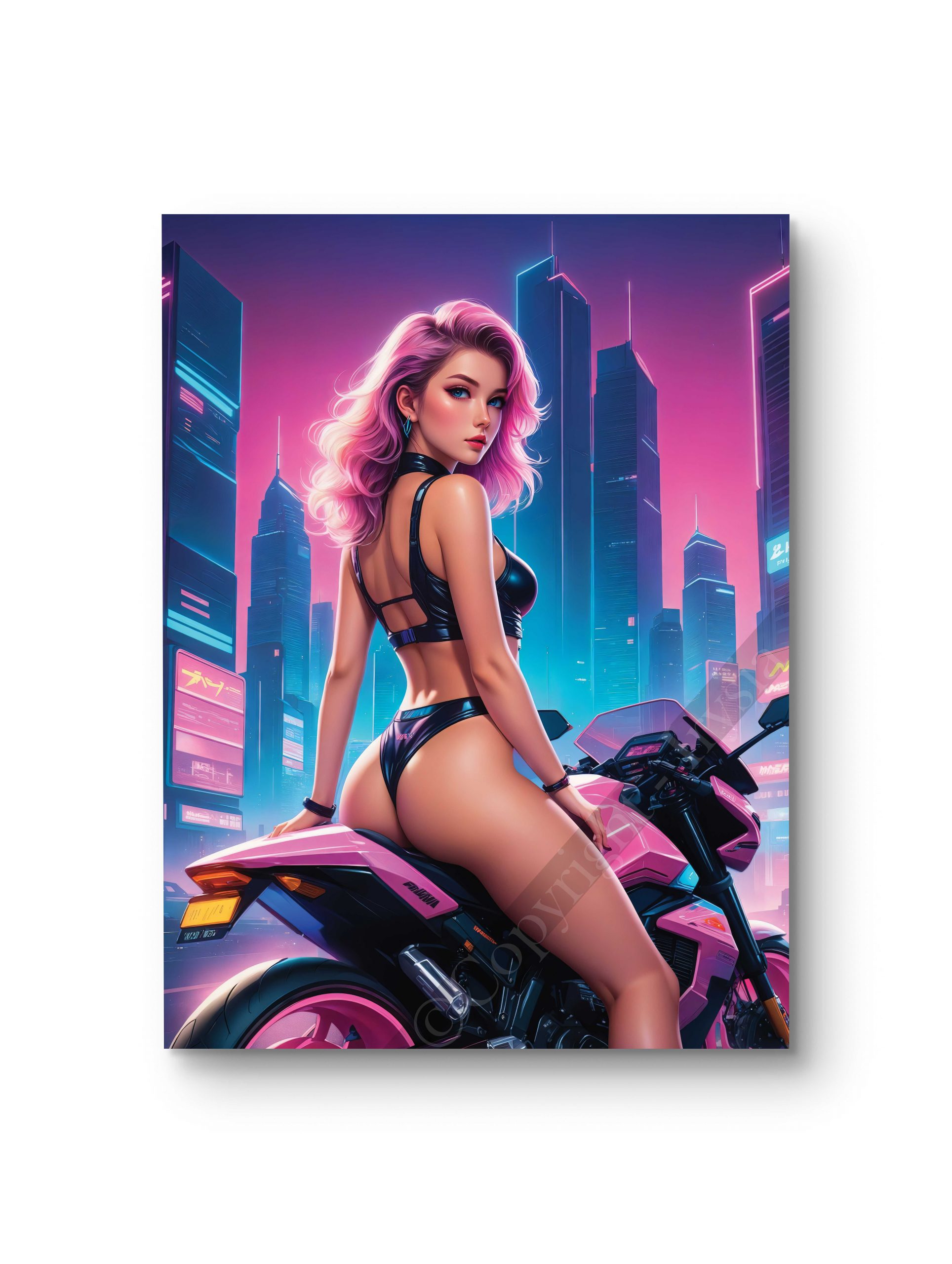Une femme posée sur une moto futuriste sous une ambiance néon éclatante. Ce tableau dynamique apporte une touche audacieuse à votre décoration intérieure. Ce tableau offre une impression haute définition sur toile, verre, verre acrylique et aluminium,