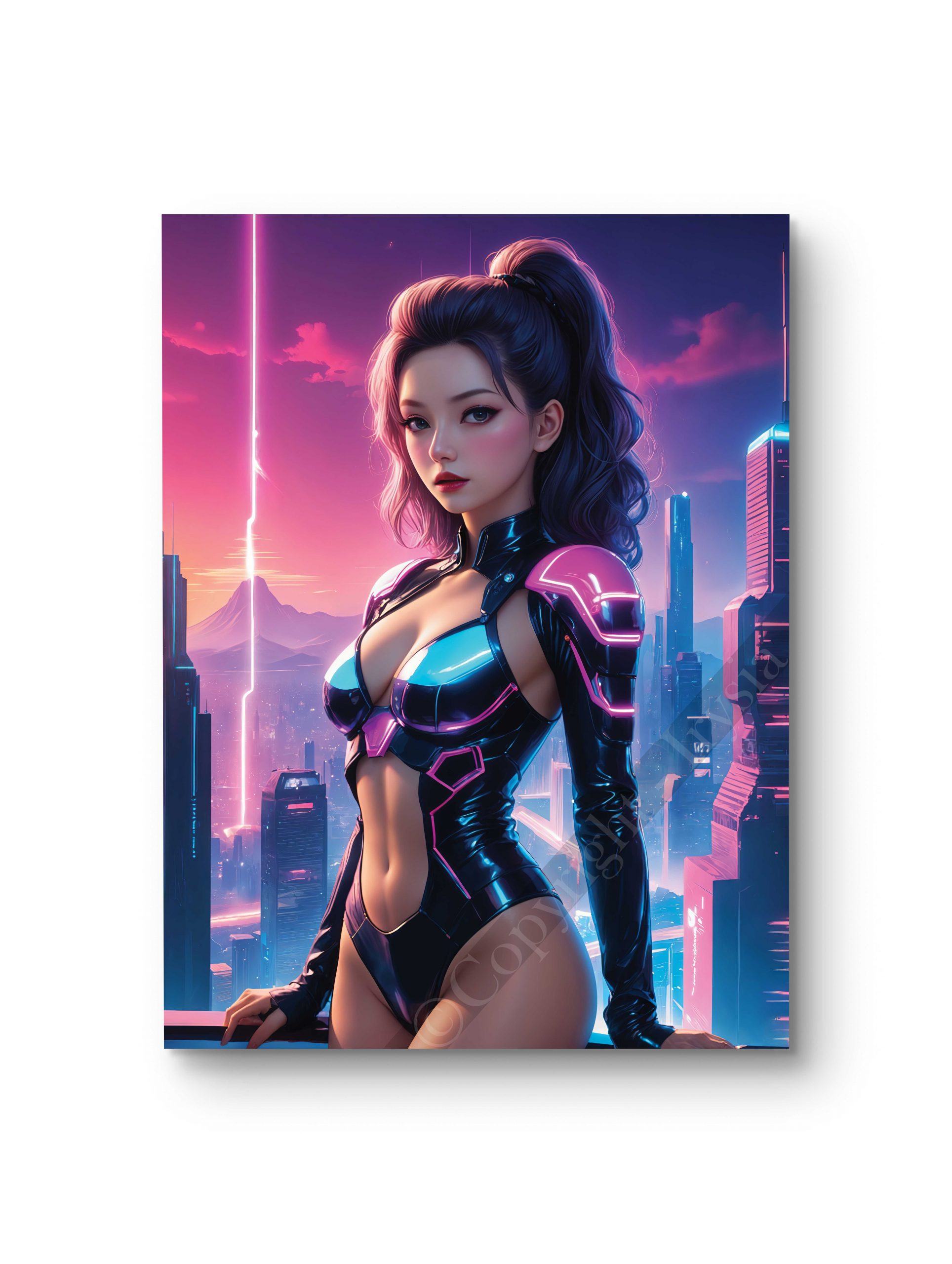 Un portrait d’une femme cyberpunk sous un ciel néon, mélangeant esthétique rétro-futuriste et modernité. Disponible en plusieurs tailles et supports. Ce tableau offre une impression haute définition sur toile, verre, verre acrylique et aluminium,