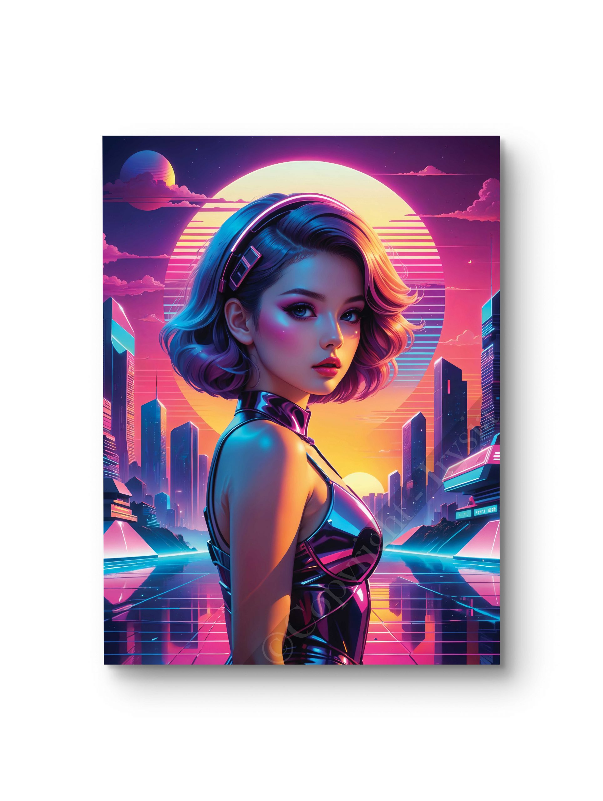 Une femme élégante sous une lumière cyberpunk intense, avec une ambiance rétro-futuriste marquée par des néons vibrants. Idéal pour une déco sophistiquée et moderne. Impression haute définition sur divers supports. Ce tableau offre une impression haute définition sur toile, verre, verre acrylique et aluminium,