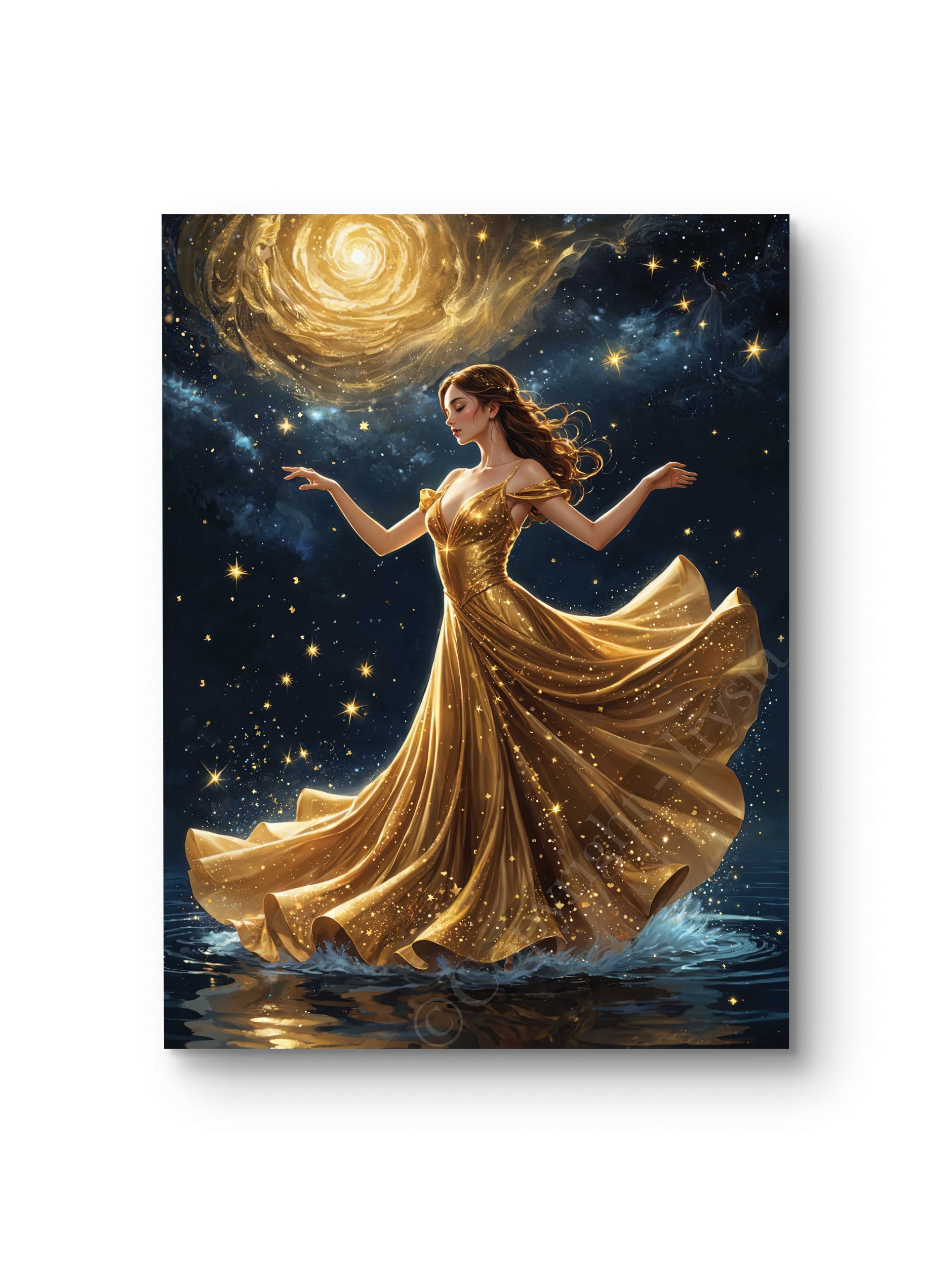 Ce tableau féerique illustre une femme vêtue d’une robe dorée, dansant sous une galaxie scintillante. Un jeu de lumière et de mouvement donne à cette œuvre une touche magique et enchanteresse. Parfait pour une décoration inspirante et sophistiquée. Disponible en plusieurs tailles et supports : toile, châssis entoilé, verre, verre acrylique et aluminium.