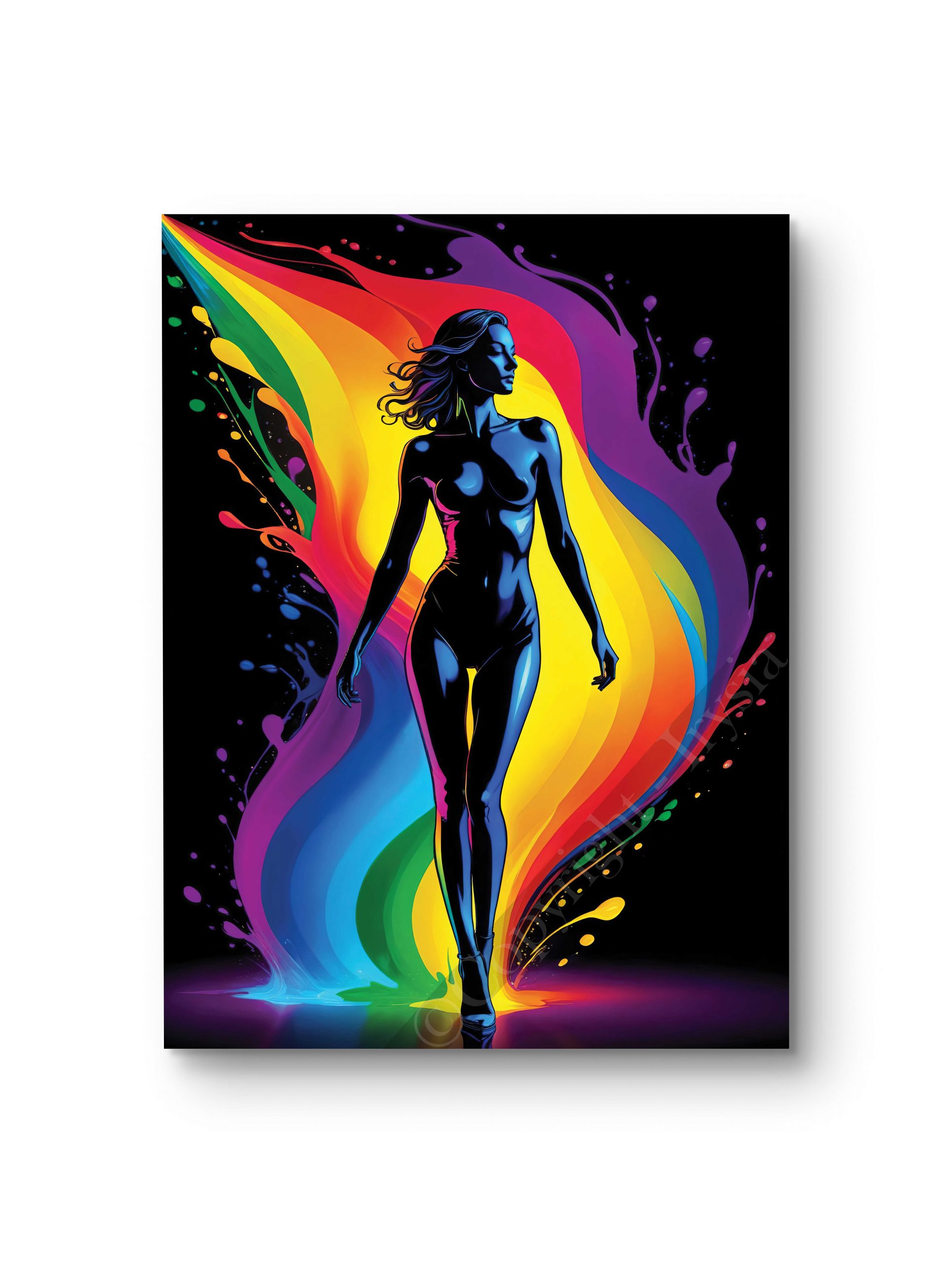 Un tableau vibrant illustrant une silhouette féminine entourée d’un arc-en-ciel éclatant. Les couleurs explosives et l’énergie de la composition en font une œuvre moderne et vivante. Parfait pour dynamiser votre intérieur avec une touche artistique contemporaine. Disponible en plusieurs tailles et supports : toile, châssis entoilé, verre, verre acrylique et aluminium.