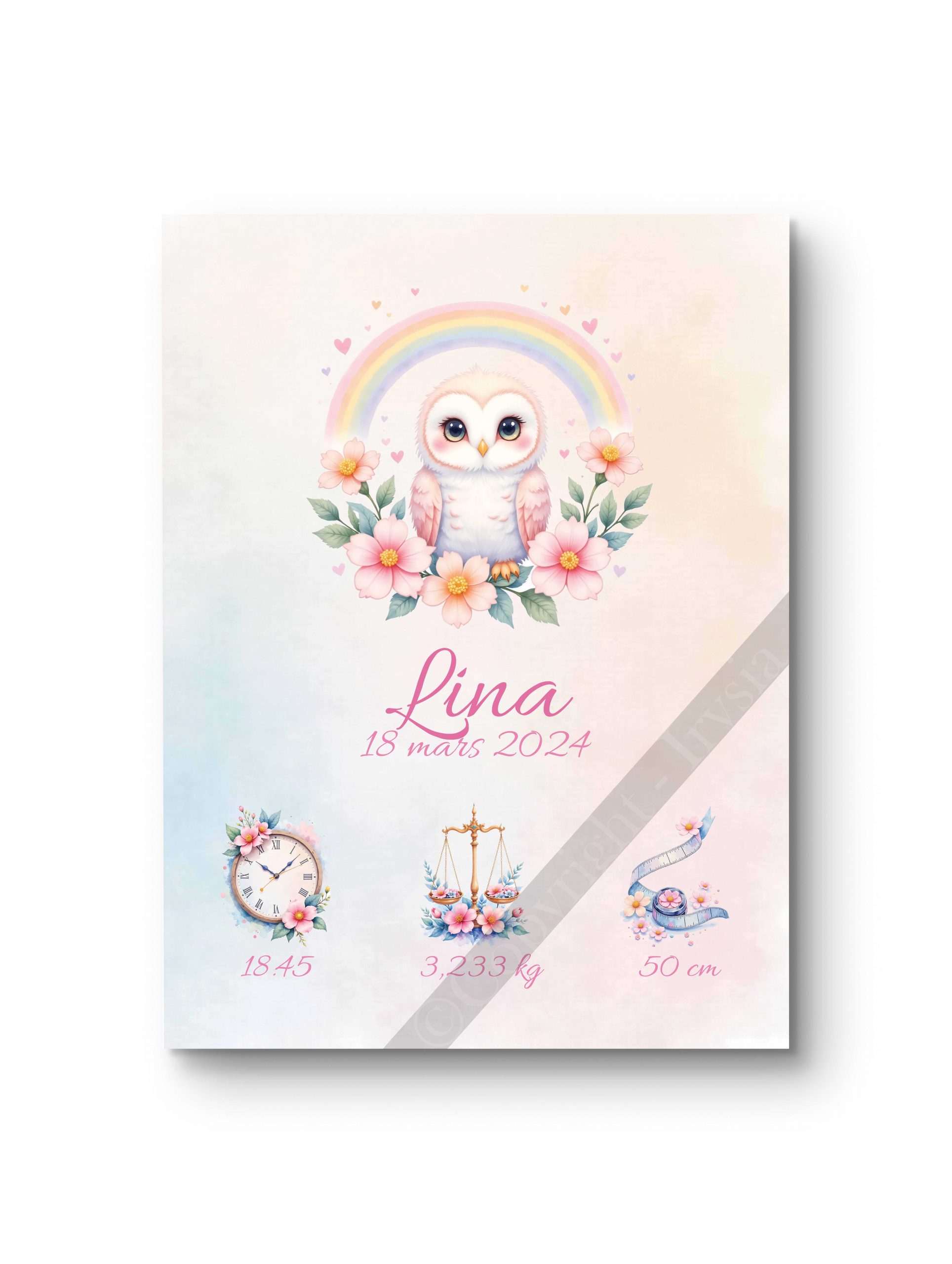 Plongez dans un univers enchanteur avec cette affiche de naissance représentant une chouette rêveuse sous un ciel pastel. Ce tableau capte la magie des premiers instants et apporte une ambiance douce et apaisante à la chambre de votre enfant. Disponible en plusieurs formats et supports, avec une impression haute définition garantissant des couleurs éclatantes et une finition soignée.