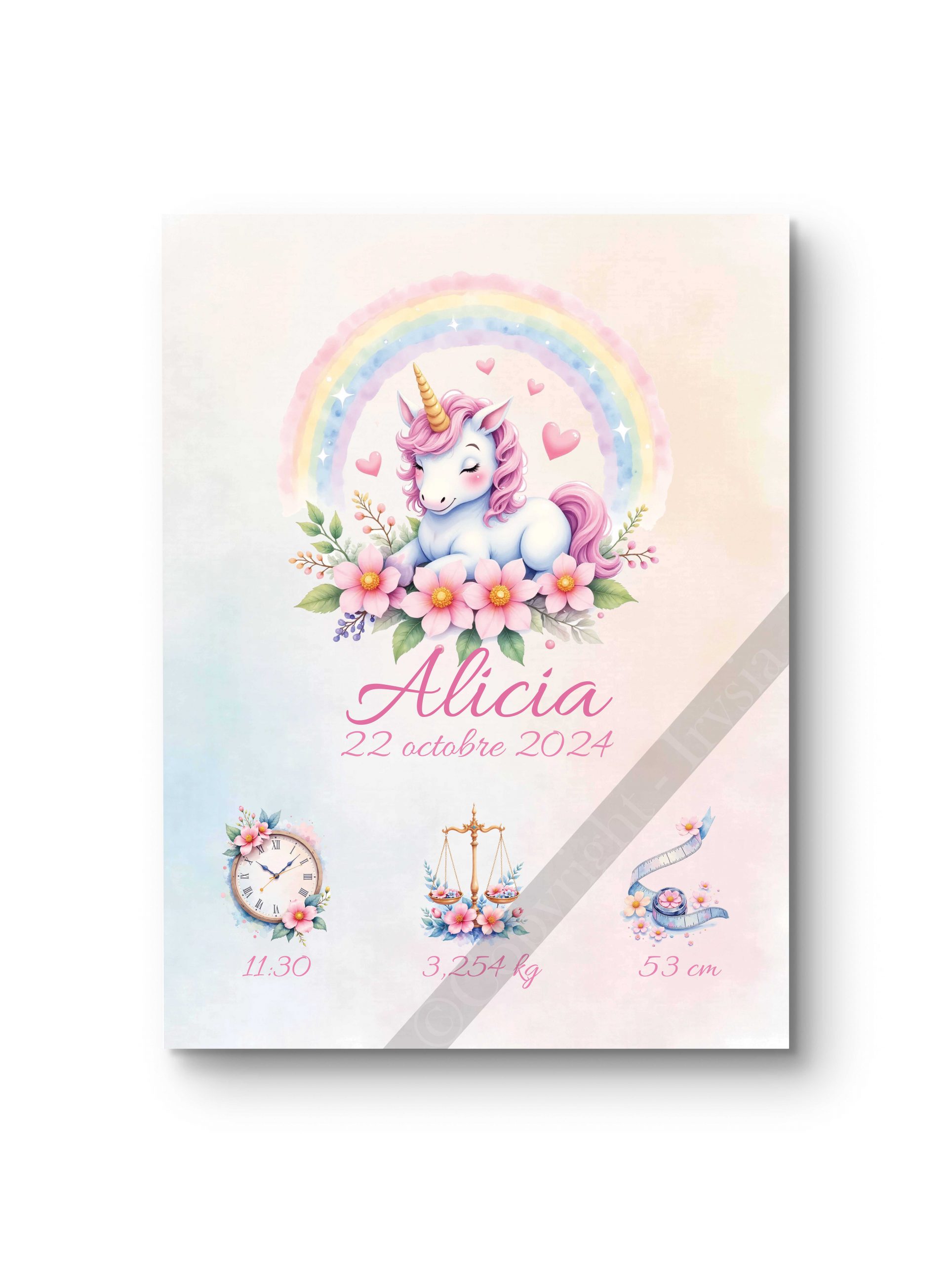 Faites de la naissance de votre enfant un souvenir inoubliable avec cette affiche illustrant une licorne magique sous un arc-en-ciel pastel. Un design enchanteur et féérique, idéal pour décorer la chambre de votre bébé tout en mettant en valeur ses informations de naissance. Disponible en plusieurs formats et supports, avec une impression haute définition garantissant des couleurs éclatantes et une finition soignée.