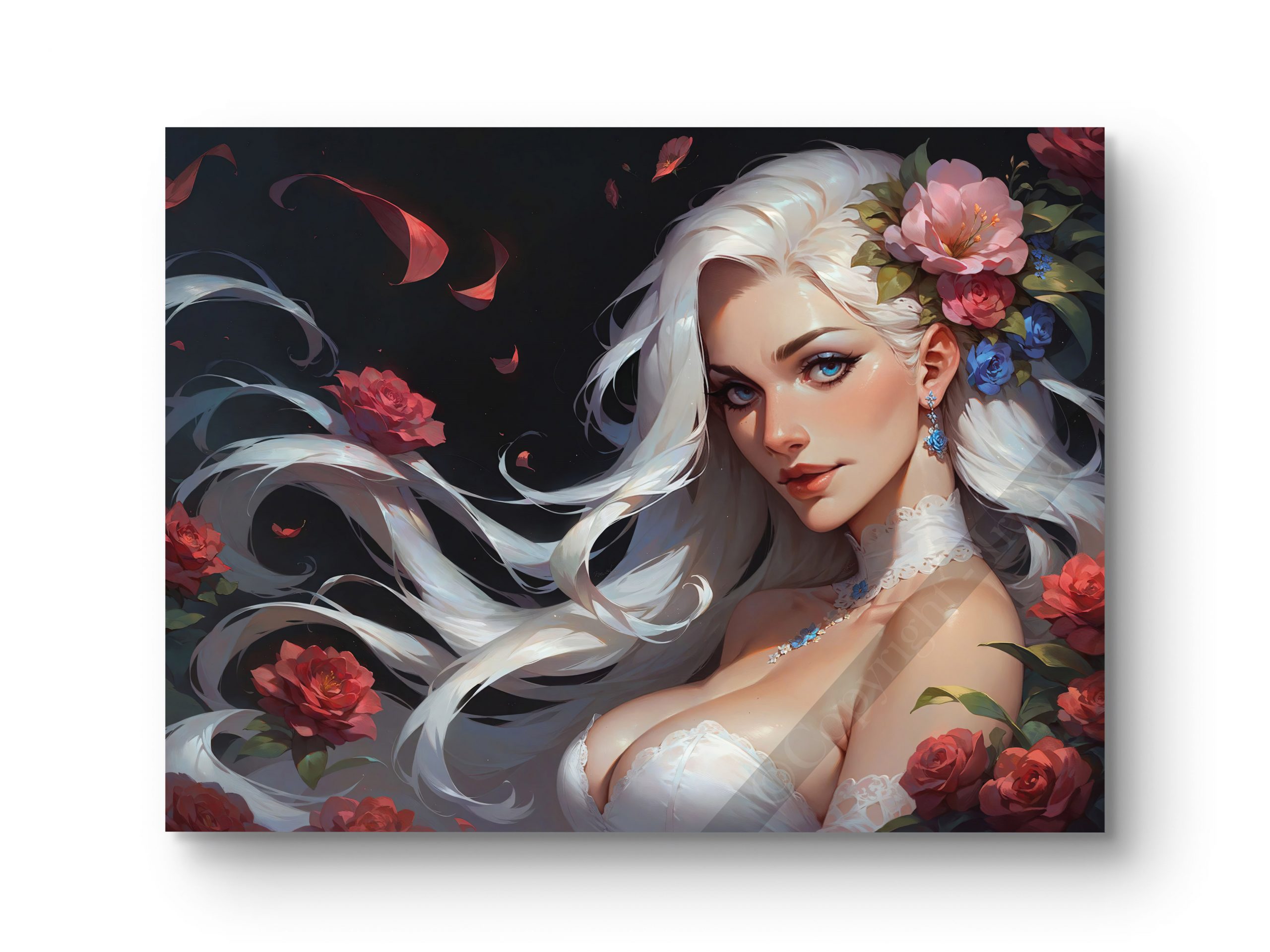 Un tableau somptueux représentant une femme à la chevelure flottante, ornée de roses éclatantes. L’association des teintes douces et de l’effet de mouvement crée une composition fluide et expressive. Un choix idéal pour une décoration artistique et sophistiquée.