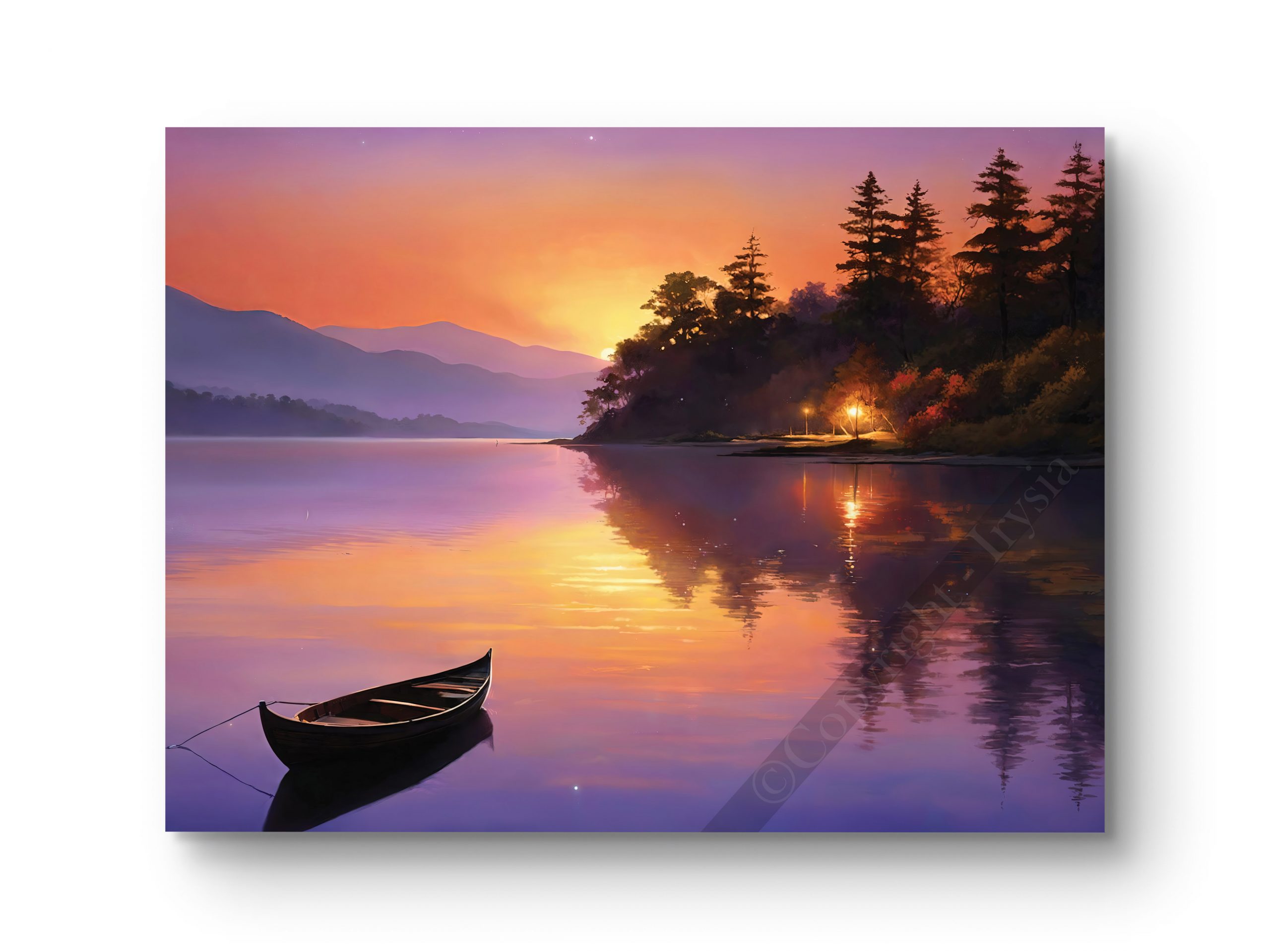 Un tableau apaisant représentant un lac sous un crépuscule doré, où une barque solitaire flotte doucement. Les reflets chauds du soleil couchant sur l’eau créent une scène harmonieuse et relaxante. Disponible sur toile, châssis entoilé, verre, verre acrylique et aluminium, ce tableau offre une impression haute définition, idéale pour une décoration reposante et élégante.