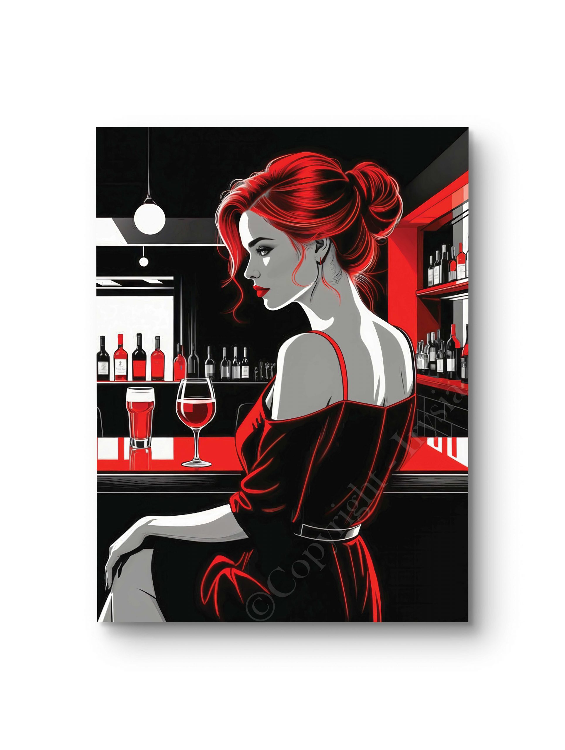 Ce tableau élégant illustre une femme sophistiquée, vêtue de rouge, assise dans un bar à l’ambiance feutrée. Le style minimaliste en noir, blanc et rouge confère une touche moderne et raffinée. Disponible en toile, châssis entoilé, verre, verre acrylique et aluminium, ce tableau sublime n’importe quel intérieur avec son contraste saisissant et son atmosphère chic. L’impression haute définition assure un rendu éclatant des couleurs et des jeux d’ombres.