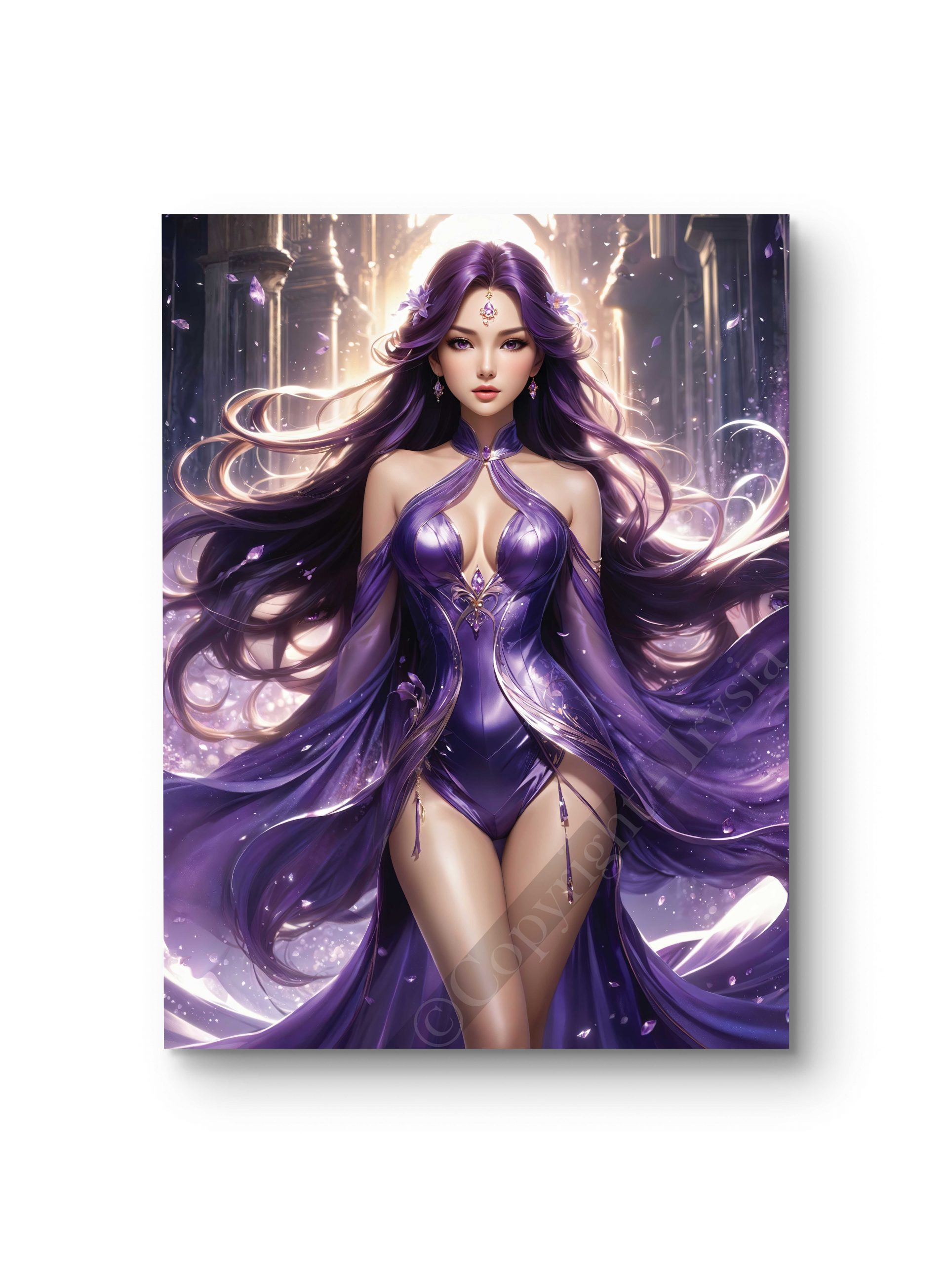 Un tableau fascinant illustrant une silhouette féminine en tenue violette dans un décor mystique. Les jeux de lumière et les détails soignés confèrent à cette œuvre une présence hypnotique. Parfait pour une décoration élégante et intrigante. Disponible en plusieurs tailles et supports : toile, châssis entoilé, verre, verre acrylique et aluminium.