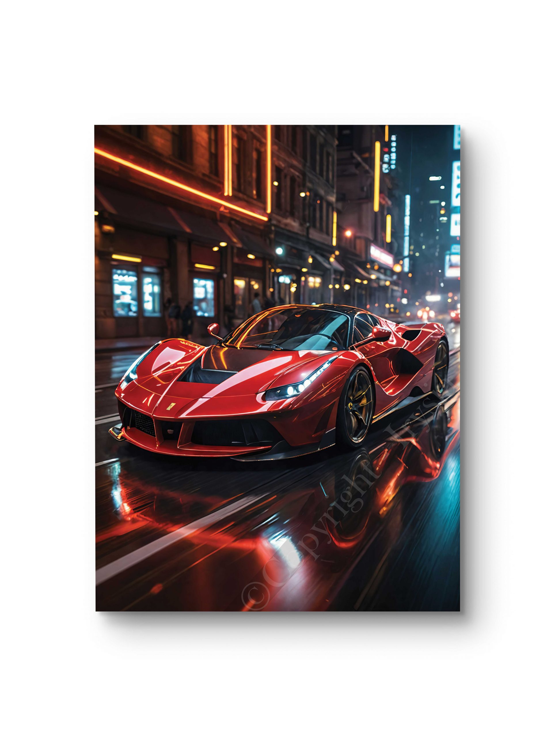 Ce tableau dynamique capture l’essence de la vitesse avec une voiture de sport rouge flamboyante roulant à toute allure dans une ville illuminée. Parfait pour une décoration moderne et énergique, ce tableau apporte une touche d’adrénaline et de luxe à votre intérieur. Disponible en plusieurs tailles et supports : toile, châssis entoilé, verre, verre acrylique et aluminium.