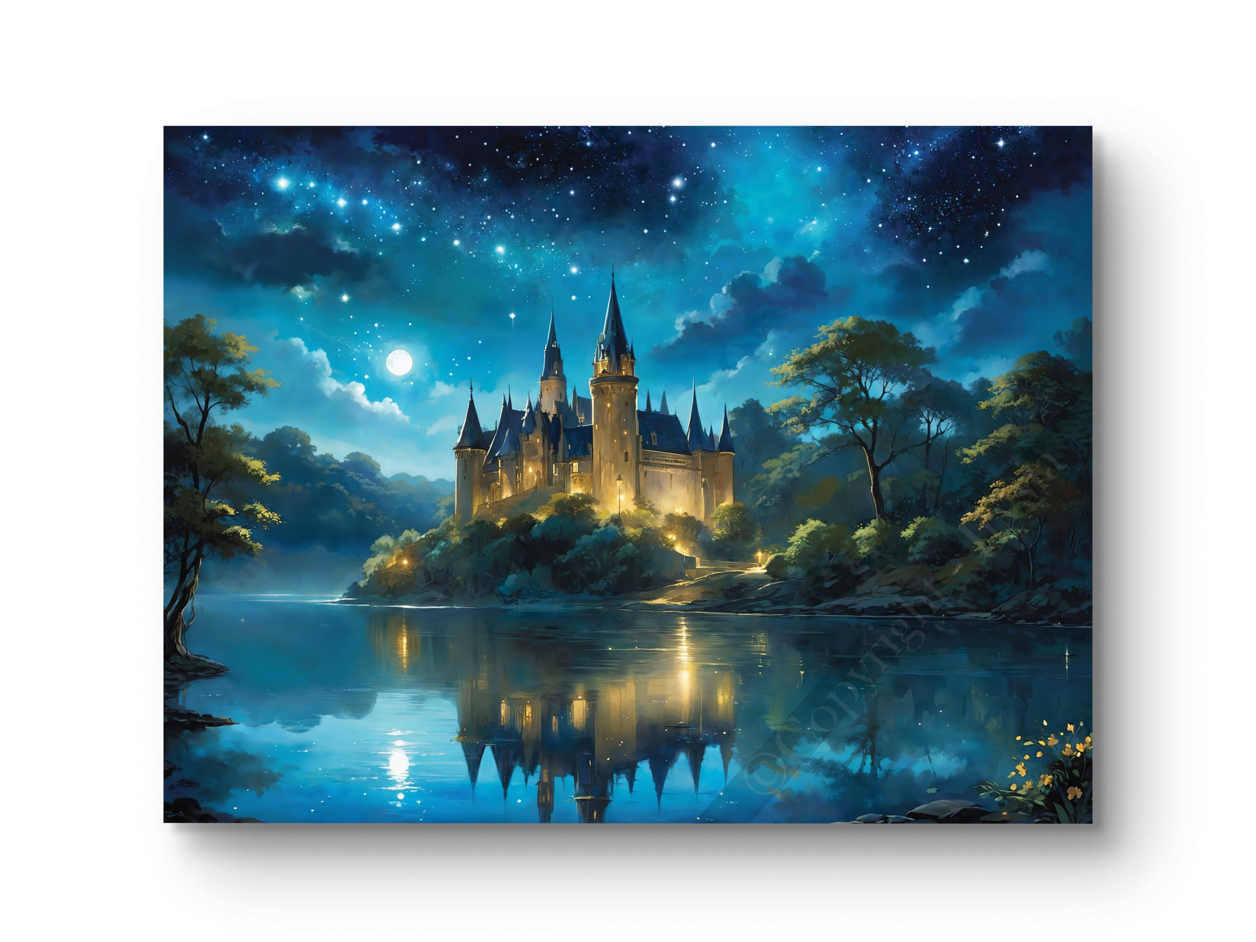 Ce tableau féerique représente un château majestueux entouré d’un lac, sous un ciel étoilé scintillant. L’architecture détaillée et les reflets dans l’eau créent une composition harmonieuse et immersive. Disponible en plusieurs tailles et supports, notamment toile, châssis entoilé, verre, verre acrylique et aluminium, il bénéficie d’une impression haute définition pour une qualité d’image exceptionnelle. Un tableau idéal pour une décoration élégante et onirique, inspirée des mondes enchantés.
