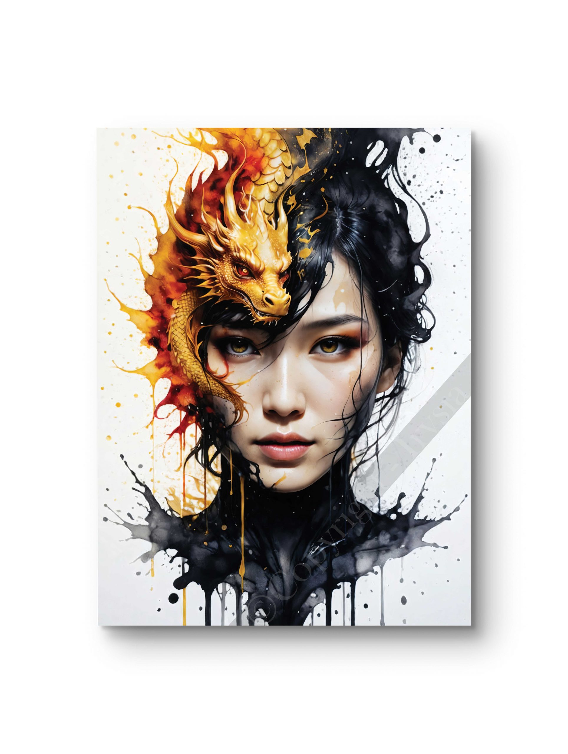 Un tableau puissant représentant un visage féminin en fusion avec des éclats de feu et d’encre. Les contrastes intenses entre noir et or créent une composition percutante et expressive. Idéal pour une décoration audacieuse et marquante. Disponible en plusieurs tailles et supports : toile, châssis entoilé, verre, verre acrylique et aluminium.