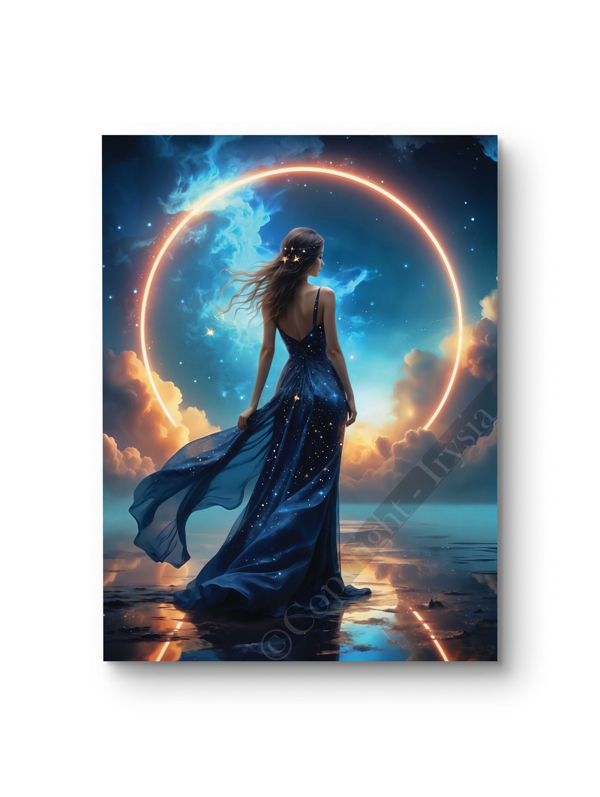Un tableau captivant mettant en scène une silhouette féminine dans une robe fluide, se tenant devant un halo lumineux. Une composition élégante et céleste qui évoque la rêverie et la poésie. Idéal pour une décoration artistique et immersive. Disponible en plusieurs tailles et supports : toile, châssis entoilé, verre, verre acrylique et aluminium.