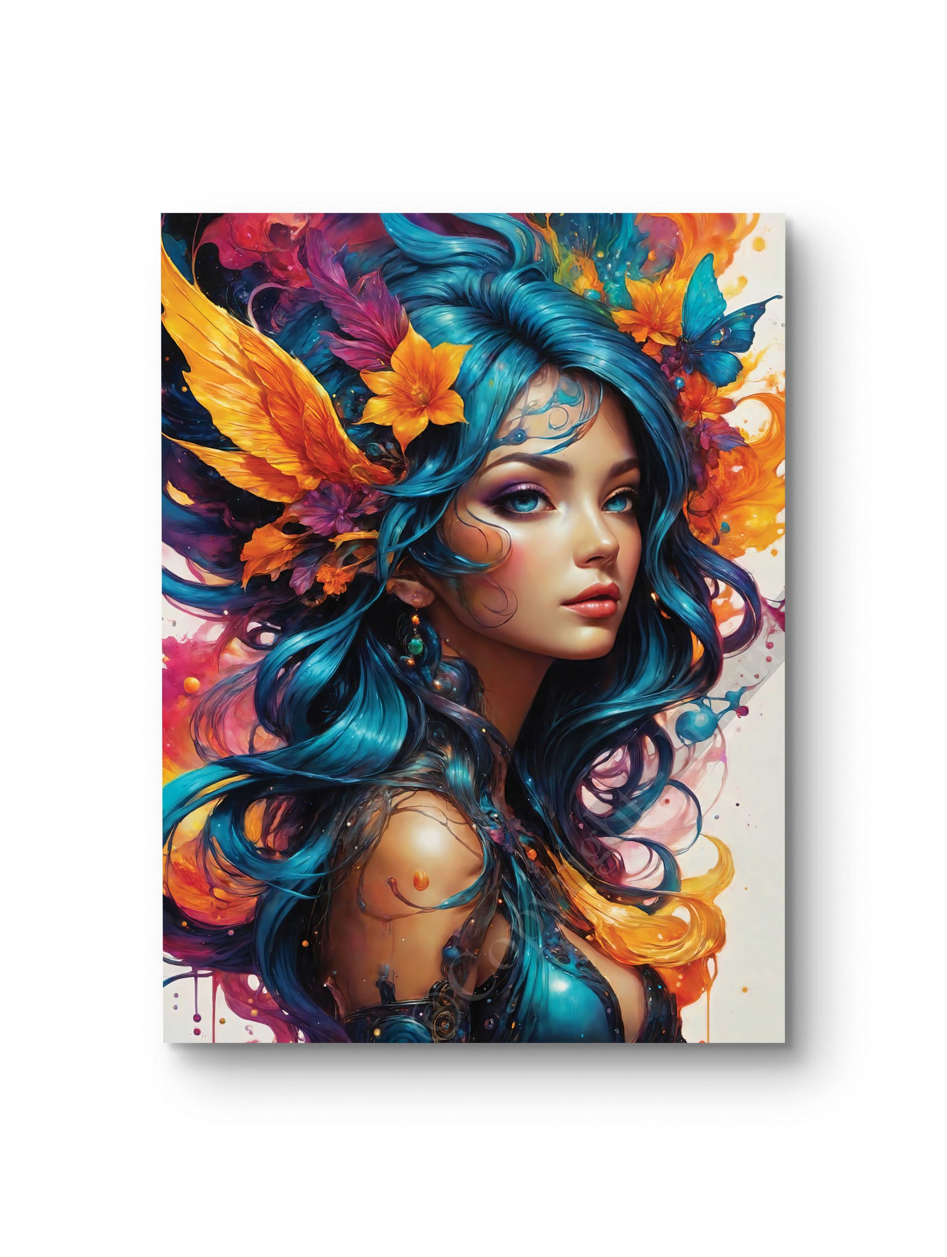Un tableau vibrant mettant en scène une femme à la chevelure flamboyante, entourée de plumes et de motifs floraux éclatants. Les couleurs intenses et les contrastes marqués apportent une dynamique fascinante à cette œuvre. Idéal pour une décoration audacieuse et expressive. Disponible en plusieurs tailles et supports : toile, châssis entoilé, verre, verre acrylique et aluminium.