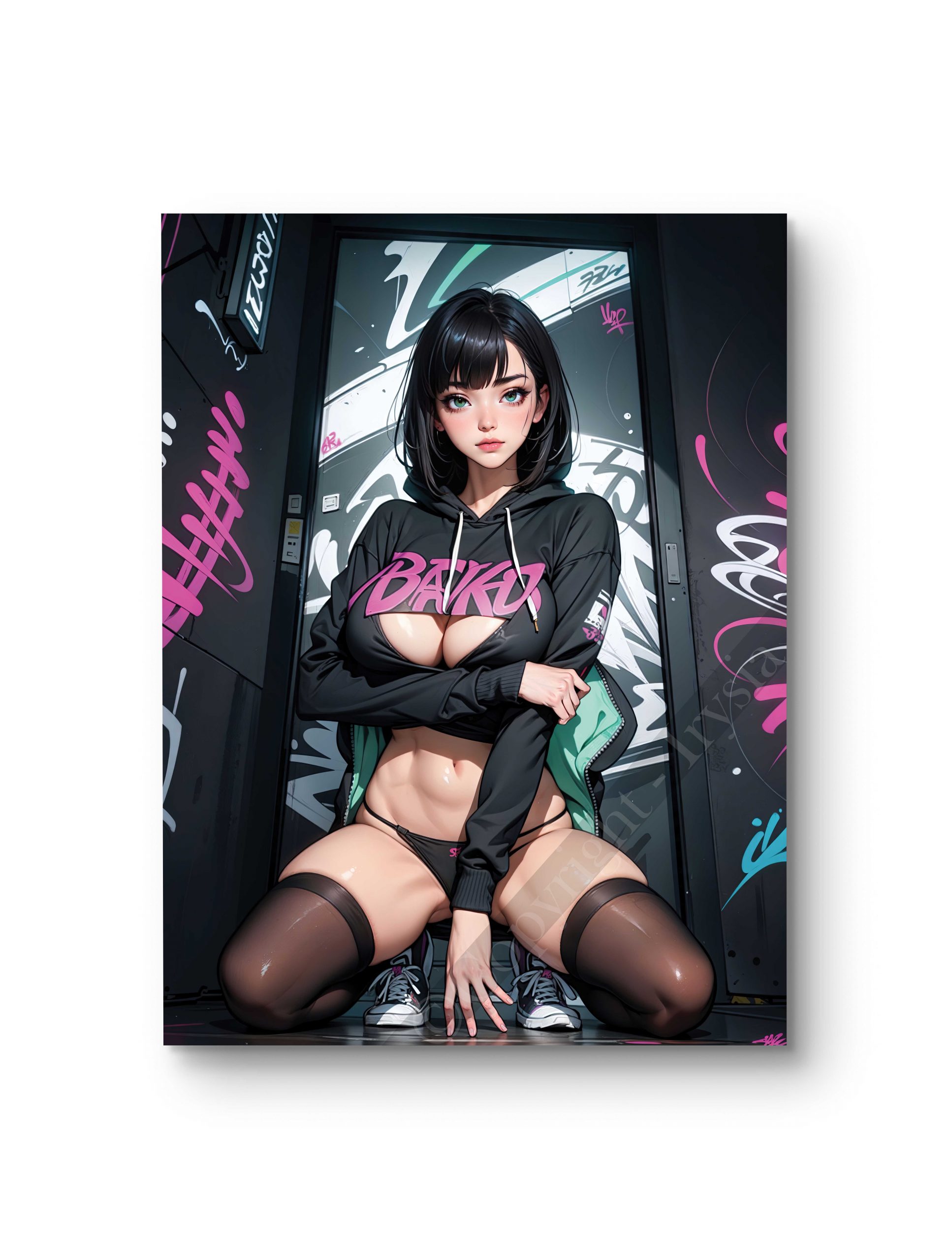 Un tableau urbain et moderne illustrant une femme dans un décor street art avec des teintes sombres et un style audacieux. Une œuvre parfaite pour les amateurs de culture urbaine et d’esthétique contemporaine. Disponible en plusieurs tailles et supports : toile, châssis entoilé, verre, verre acrylique et aluminium.