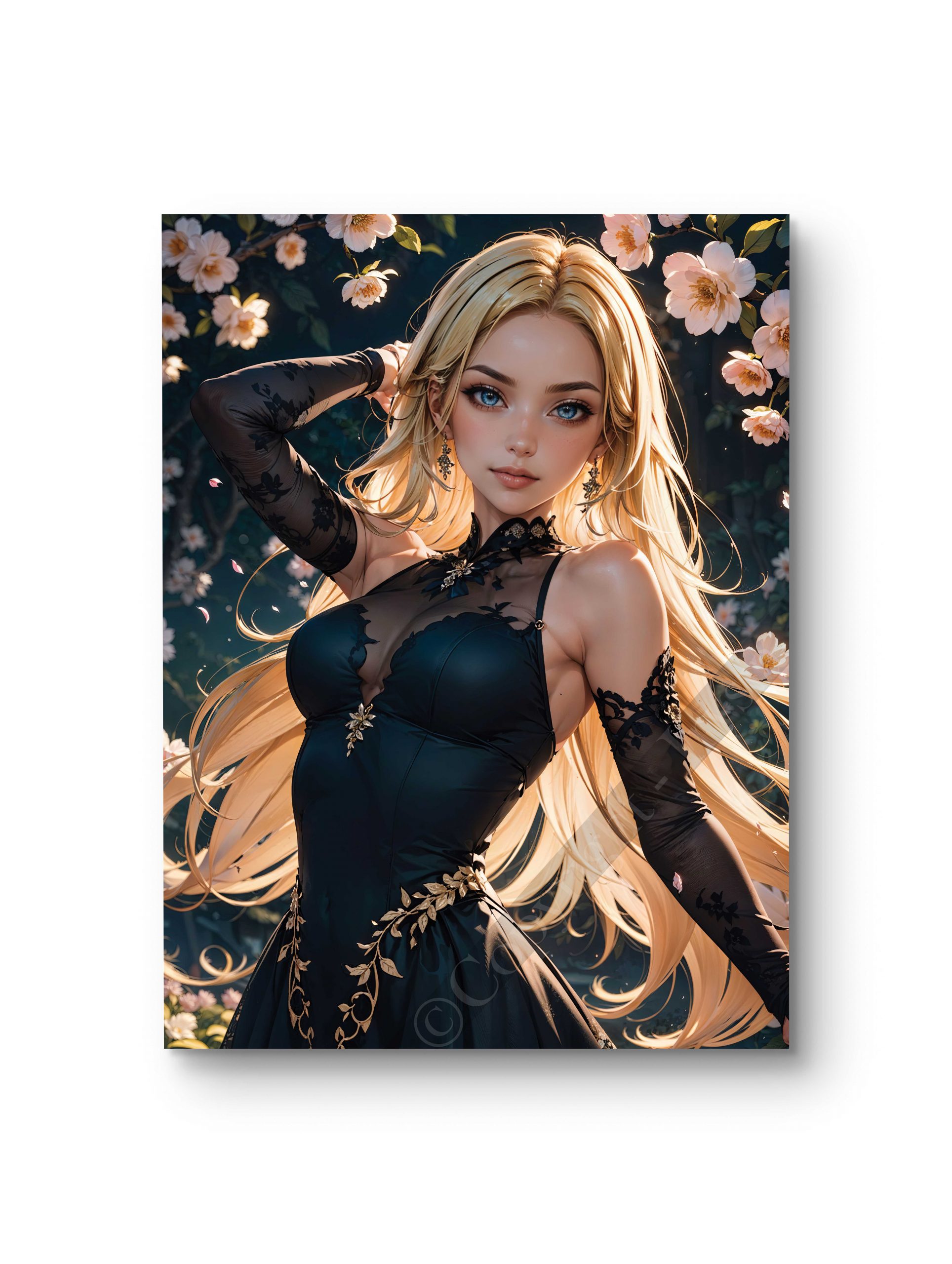 Un tableau raffiné illustrant une femme élégante vêtue de noir, entourée d’une aura mystérieuse et florale. Parfait pour une décoration sophistiquée et captivante. Disponible en plusieurs tailles et supports : toile, châssis entoilé, verre, verre acrylique et aluminium.