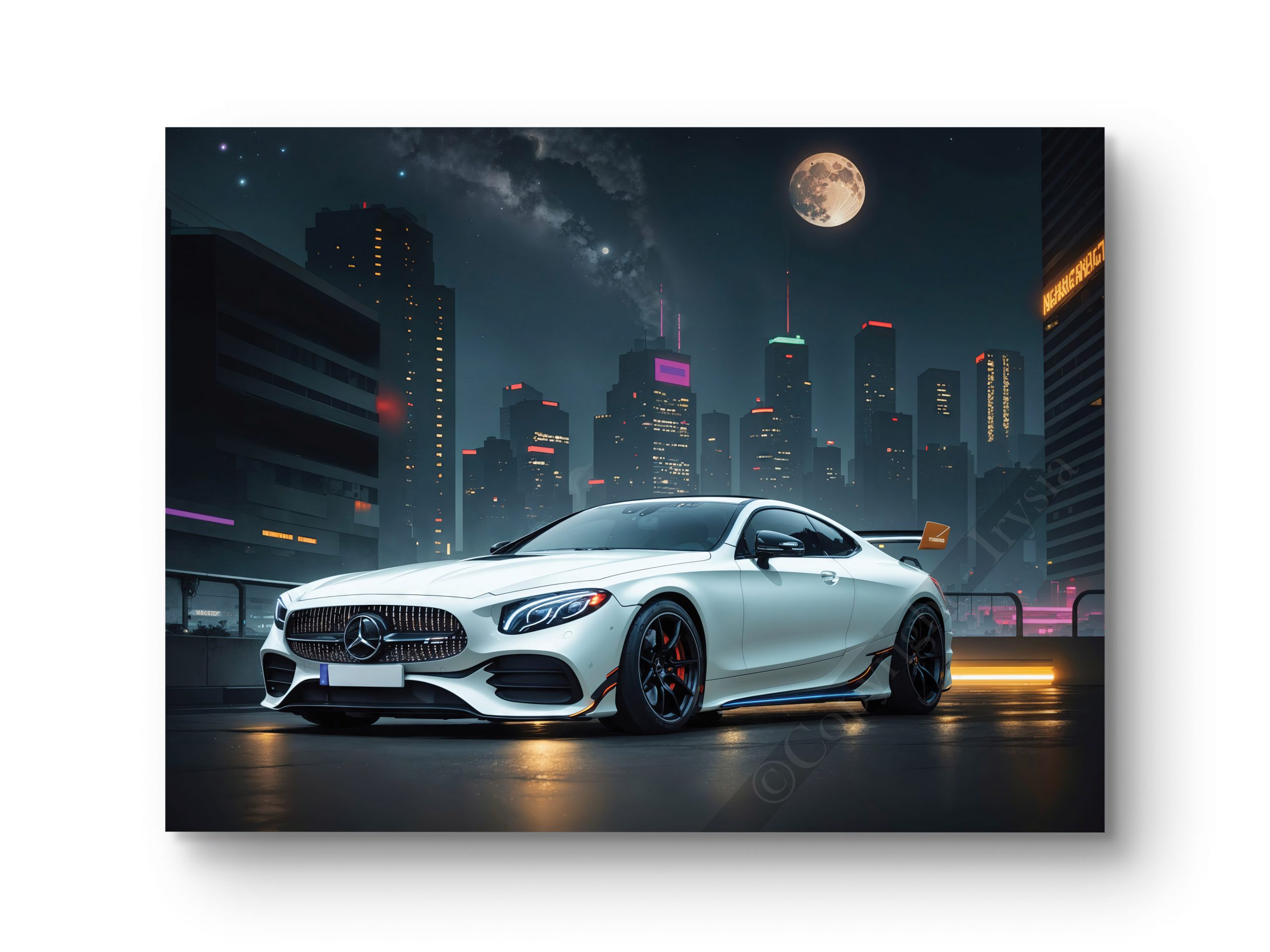 Ce tableau urbain met en scène une voiture sportive élégante sous un éclairage nocturne saisissant. Les reflets des lumières de la ville créent une atmosphère moderne et dynamique, parfaite pour les passionnés d’automobile et de design contemporain. Disponible en impression haute définition sur toile, verre et aluminium pour un rendu exceptionnel.