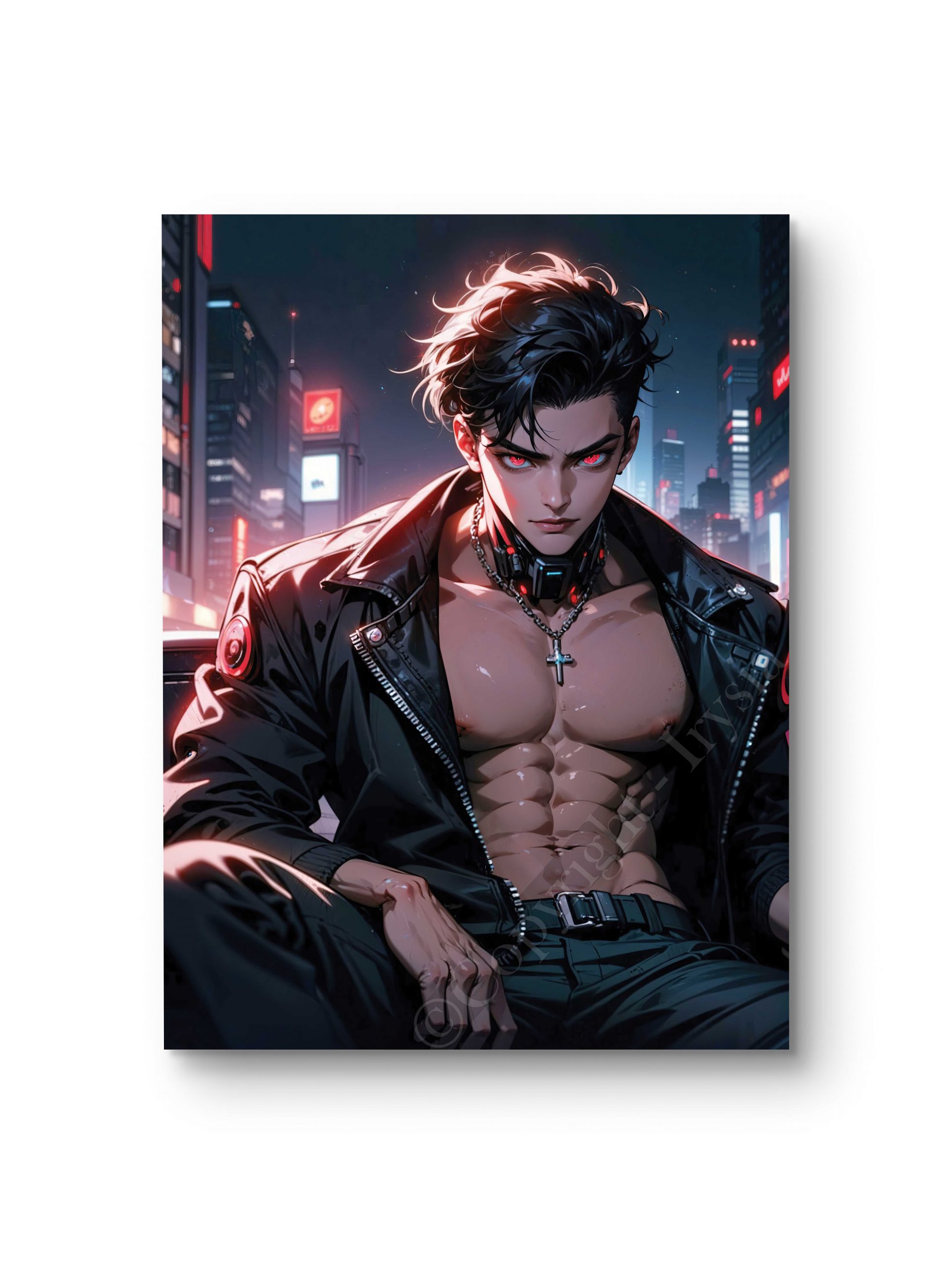 Un homme au charisme magnétique prend place dans une ville futuriste, vêtu d’un blouson en cuir et affichant un regard perçant. Son torse musclé et son attitude dominante en font une pièce idéale pour une décoration audacieuse et moderne. L’ambiance cyberpunk renforce le contraste entre les lumières urbaines et l’attitude rebelle du personnage, créant un tableau dynamique et puissant. Chaque détail, des néons aux reflets métalliques, est soigneusement travaillé pour un rendu visuel spectaculaire. Cette œuvre conviendra parfaitement aux amateurs de science-fiction et d’univers alternatifs. Disponible en plusieurs tailles et supports : toile, châssis entoilé, verre, verre acrylique et aluminium, avec une impression haute définition offrant un rendu éclatant et précis.