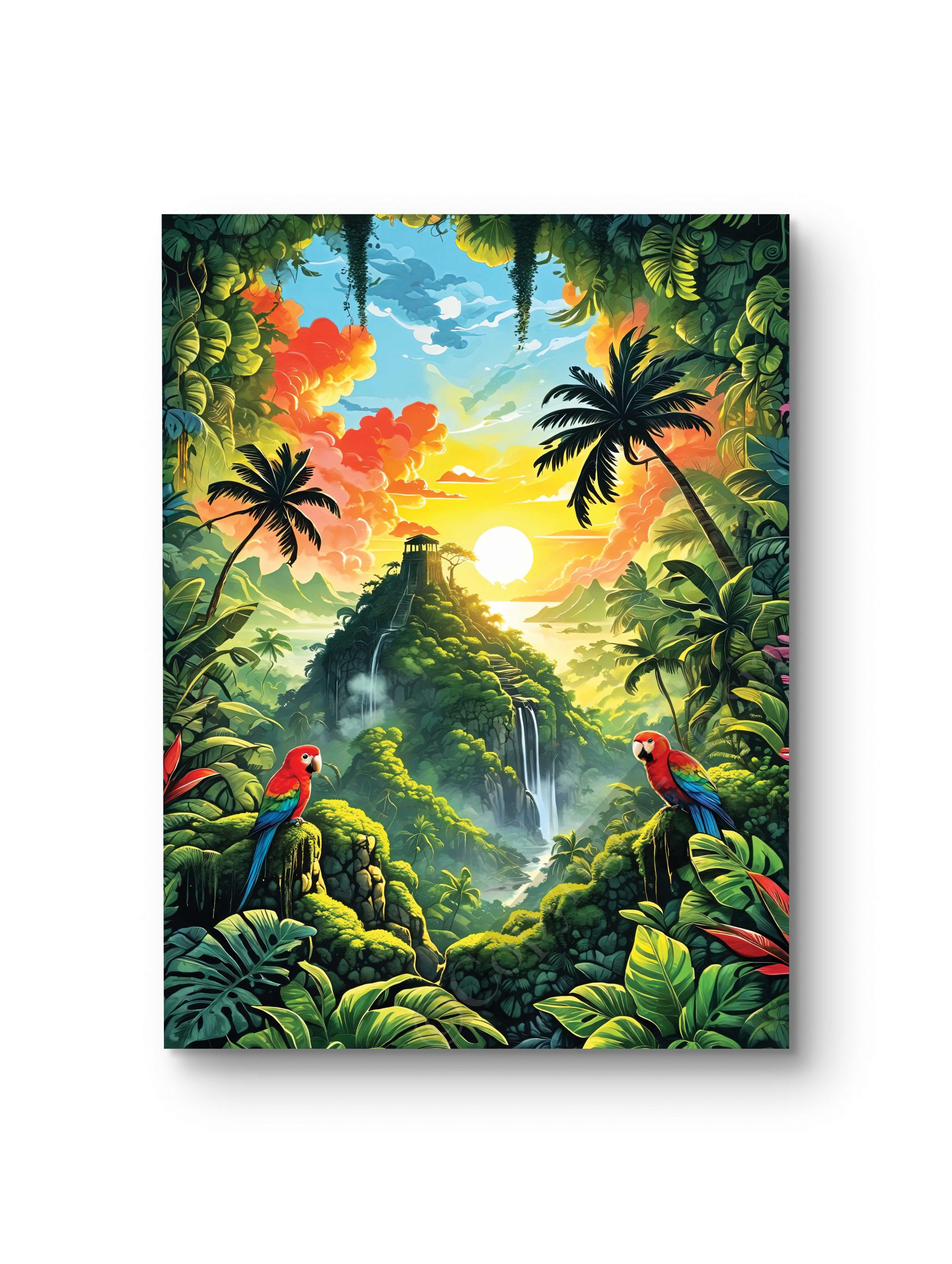 Ce tableau représente un paysage tropical luxuriant où la lumière dorée du soleil illumine chaque recoin de la jungle. La végétation dense, les montagnes en arrière-plan et les oiseaux exotiques apportent une sensation d’évasion et de sérénité. Les couleurs éclatantes et les détails minutieux créent une immersion totale dans cet univers sauvage. Disponible en toile, châssis entoilé, verre, verre acrylique et aluminium, cette œuvre est idéale pour une décoration naturelle et vibrante.