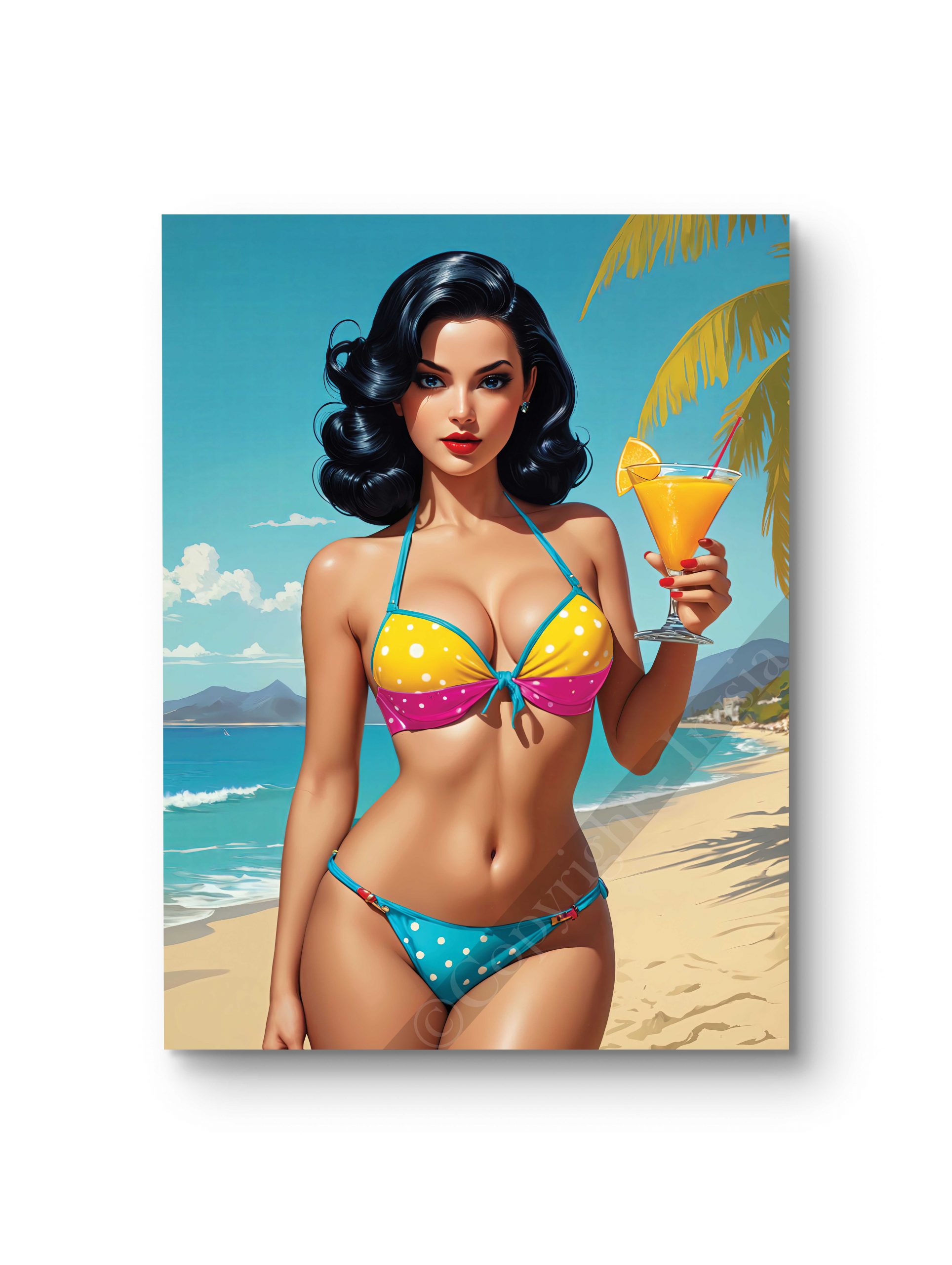 Ce tableau représente une pin-up pétillante sirotant un cocktail sur une plage exotique. Son bikini coloré et son sourire séduisant évoquent la dolce vita et les vacances d’été. Parfait pour dynamiser un intérieur avec une touche de soleil et de nostalgie. Disponible en impression haute définition sur divers supports, dont le verre acrylique.
