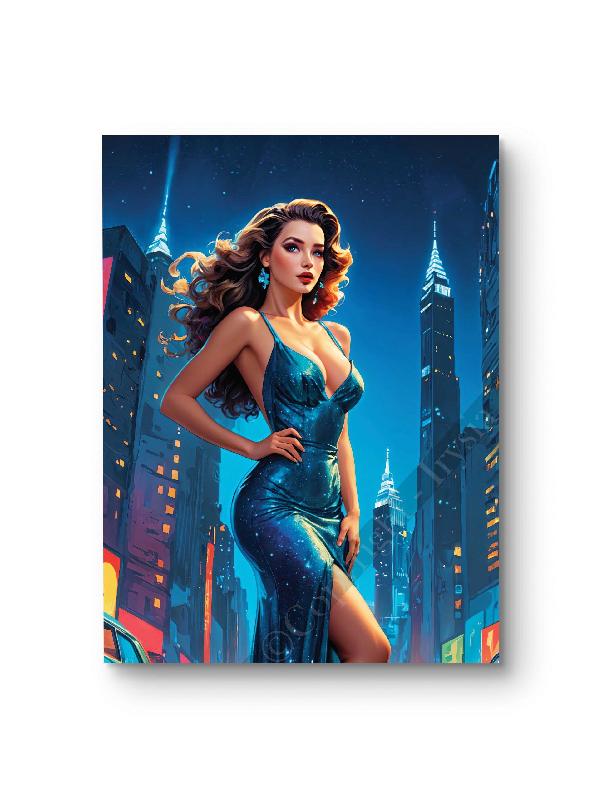 Un tableau fascinant capturant le charme d’une pin-up élégante en robe scintillante, posant sous les lumières d’une ville animée. Son charisme et son allure sophistiquée apportent une touche de glamour intemporel. Idéal pour une décoration rétro chic, disponible en impression haute qualité sur toile, verre, verre acrylique, aluminium et châssis entoilé.