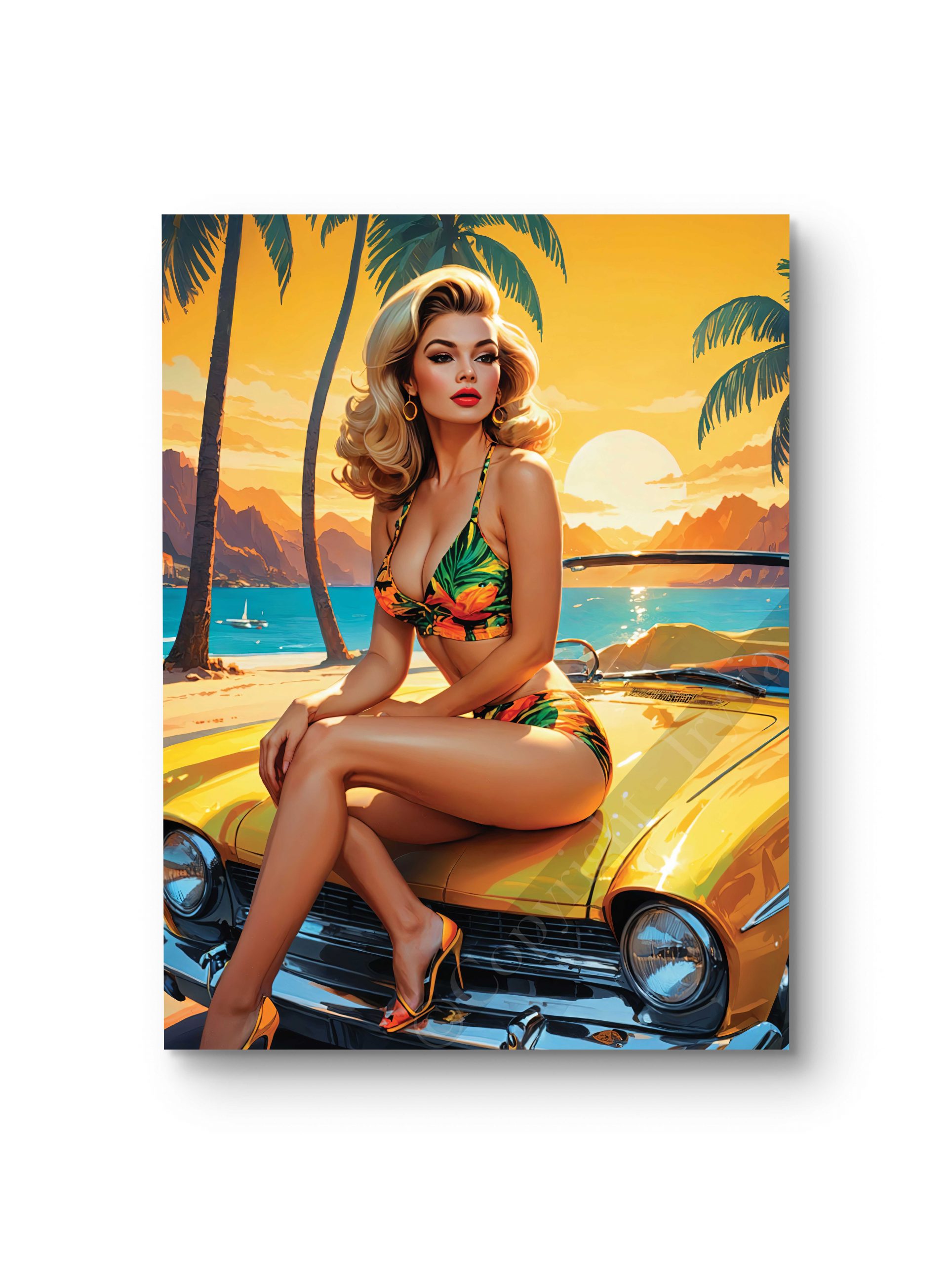 Plongez dans l’univers des plages rétro avec ce tableau représentant une pin-up assise sur le capot d’une voiture classique. Son maillot de bain tropical et son expression charismatique évoquent le charme ensoleillé des années 50. Une œuvre parfaite pour une décoration vintage pleine de fraîcheur et d’élégance. Disponible sur toile, verre, aluminium et châssis entoilé.