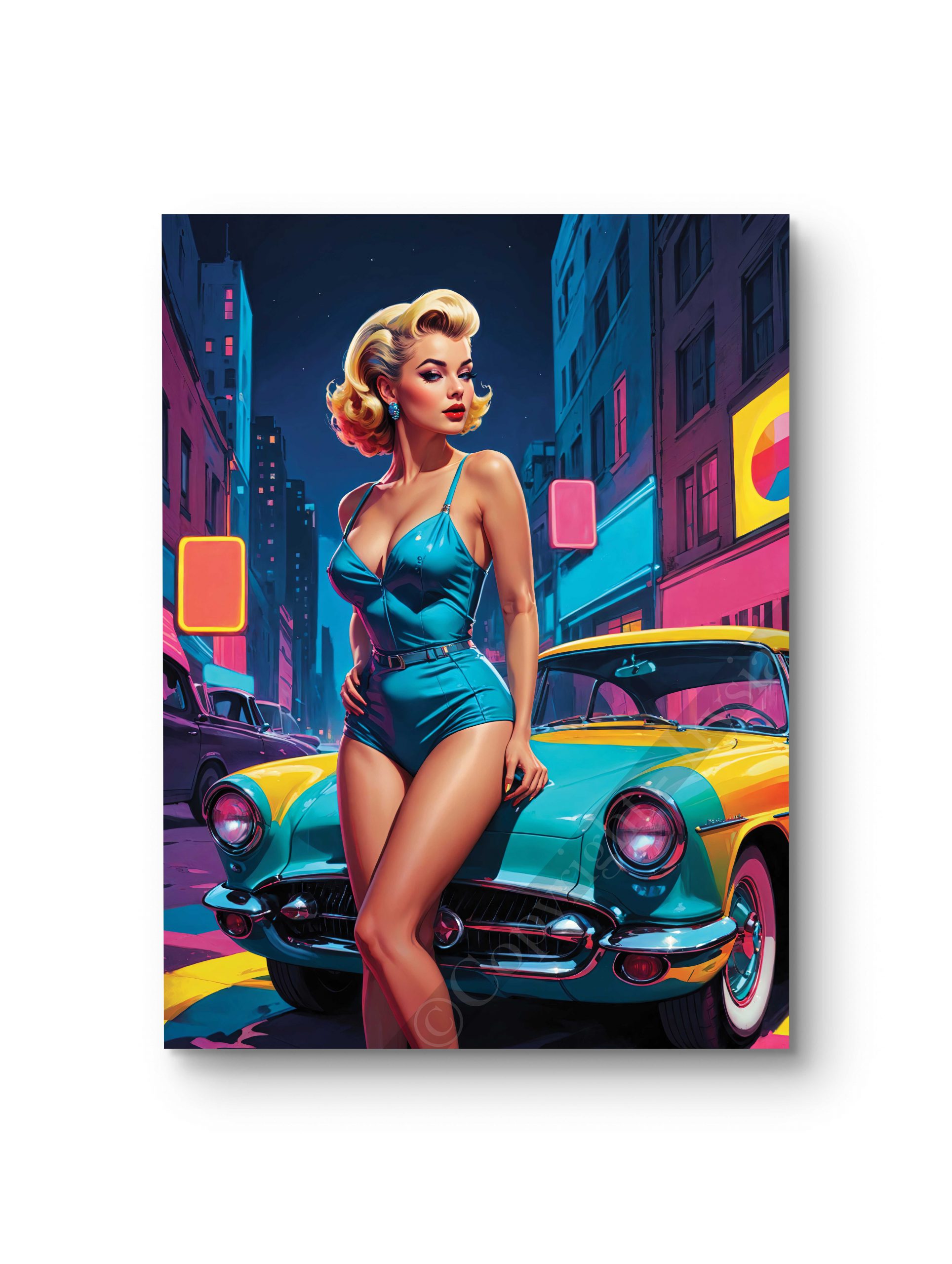 Plongez dans l’univers vintage avec ce tableau illustrant une pin-up blonde en maillot bleu, posant devant une voiture de collection sous des lumières de ville éclatantes. Son style rétro et son allure confiante évoquent le glamour des années 50. Un tableau idéal pour insuffler une ambiance nostalgique et chic à votre intérieur. Disponible sur divers supports d’impression.