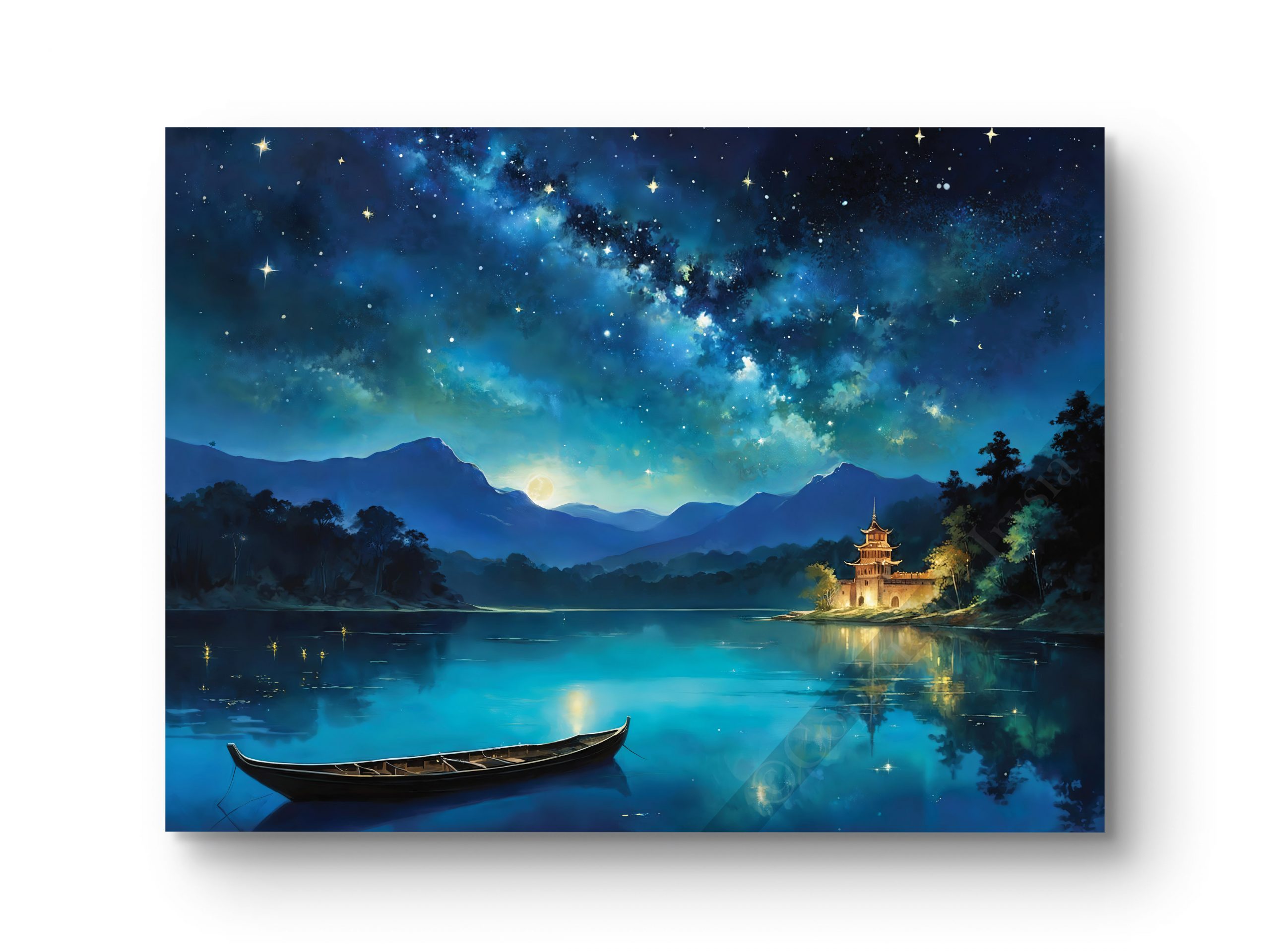 Plongez dans un décor enchanteur avec ce tableau représentant un lac paisible sous un ciel étoilé. La Voie Lactée se reflète dans l’eau calme, créant une atmosphère mystique et apaisante. La barque solitaire accentue cette sensation d’évasion et de sérénité. Idéal pour un intérieur relaxant, ce tableau est disponible sur toile, châssis entoilé, verre, verre acrylique et aluminium. Son impression haute définition garantit un rendu éclatant et une durabilité exceptionnelle, parfait pour transformer votre espace en un sanctuaire de tranquillité et de contemplation.