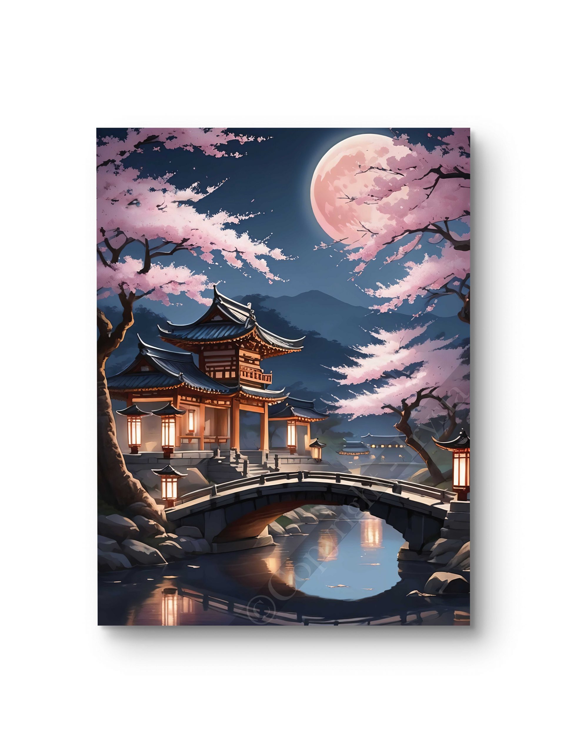 Plongez dans un décor féérique avec ce tableau représentant un temple japonais illuminé sous une lune resplendissante. Le pont en pierre et les reflets dans l’eau créent une atmosphère empreinte de sérénité et d’élégance. Les nuances de bleu et de rose offrent un équilibre harmonieux, parfait pour une décoration qui invite à l’évasion. Impression haute définition sur toile, châssis entoilé, verre, verre acrylique et aluminium, garantissant un rendu éclatant et durable.