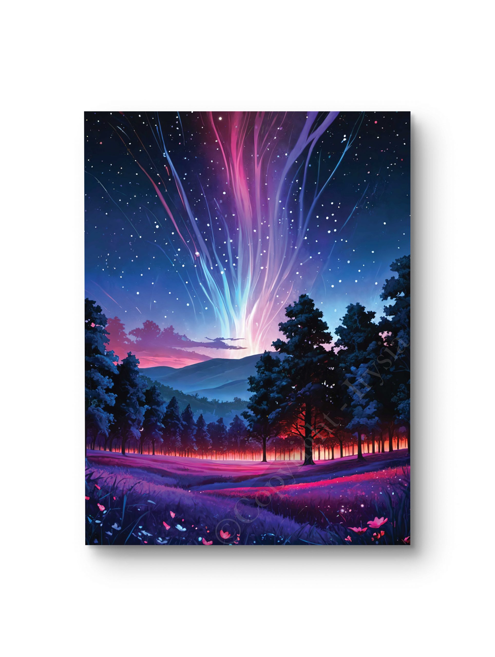 Un tableau hypnotisant mettant en scène une aurore boréale illuminant une vallée boisée sous un ciel étoilé. L’éclat céleste et les contrastes lumineux en font une pièce idéale pour une atmosphère apaisante et cosmique. Disponible en plusieurs tailles et supports : toile, châssis entoilé, verre, verre acrylique et aluminium.