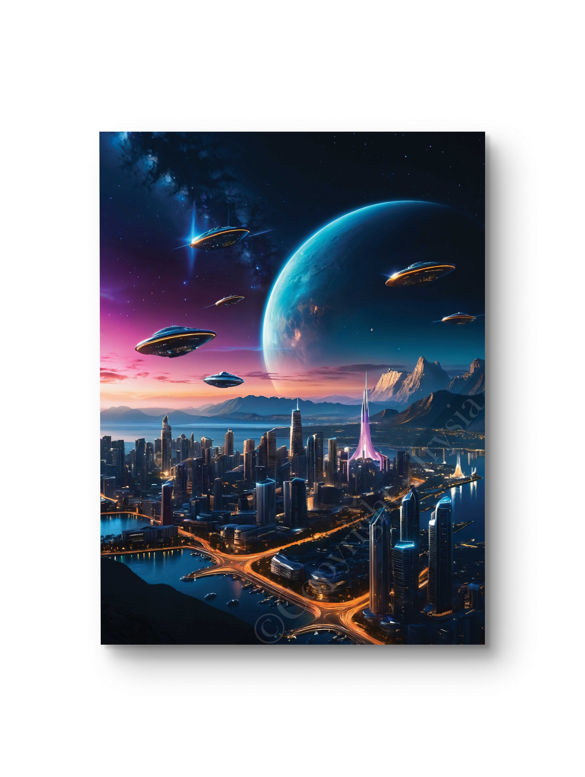 Voyagez vers un futur spectaculaire avec ce tableau illustrant une ville avancée sous un ciel spatial, où des vaisseaux évoluent au-dessus d’une métropole ultra-moderne. L’association des lumières urbaines et de l’immensité cosmique crée une scène fascinante, parfaite pour les amateurs de science-fiction et d’astronomie. Les structures futuristes et les effets lumineux renforcent l’ambiance immersive de cette œuvre. Ce visuel inspirant apporte une touche d’évasion et d’innovation à votre décoration. Disponible en impression haute définition sur toile, châssis entoilé, verre, verre acrylique et aluminium.